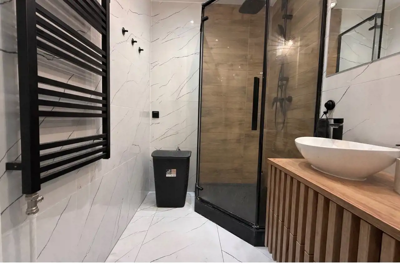 Mieszkanie zostało wykończone z dobrych jakościowo materiałów, a wszystkie elementy wyposażenia są spójne stylistycznie i dobrze utrzymane.