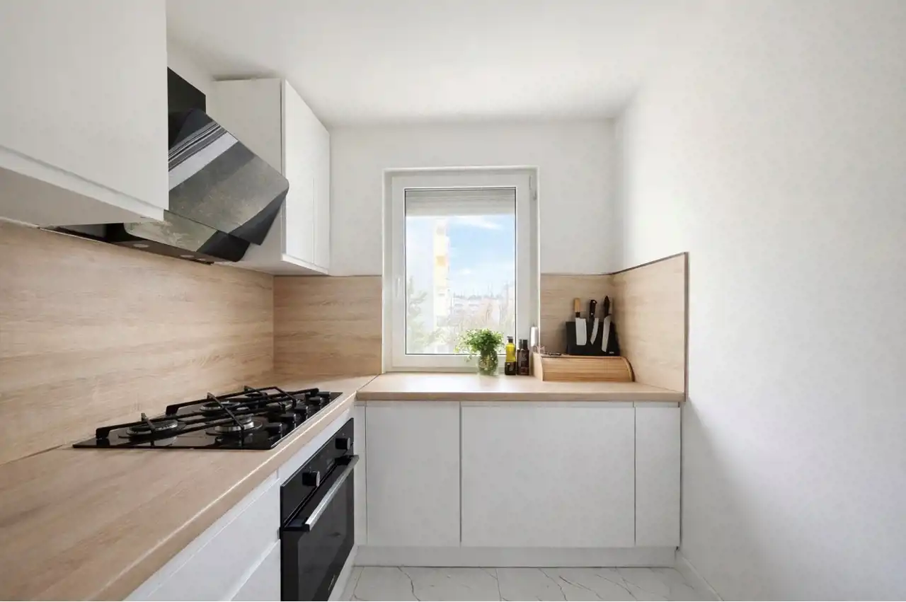 Kuchnia wykonana w nowoczesnej zabudowie z pełnym wyposażeniem AGD. Wnętrza są jasne i przyjemne, a duże okna zapewniają dużo naturalnego światła.