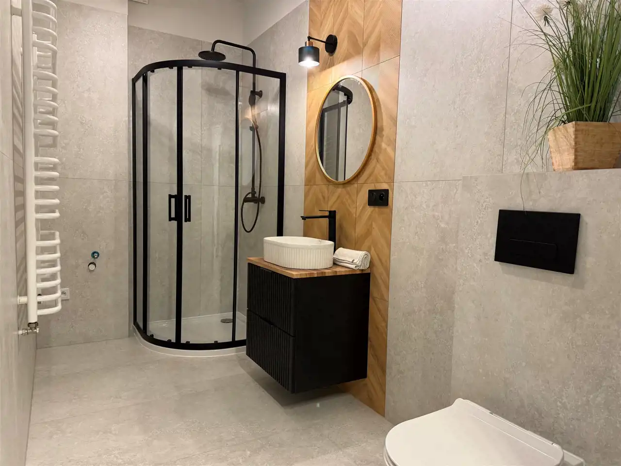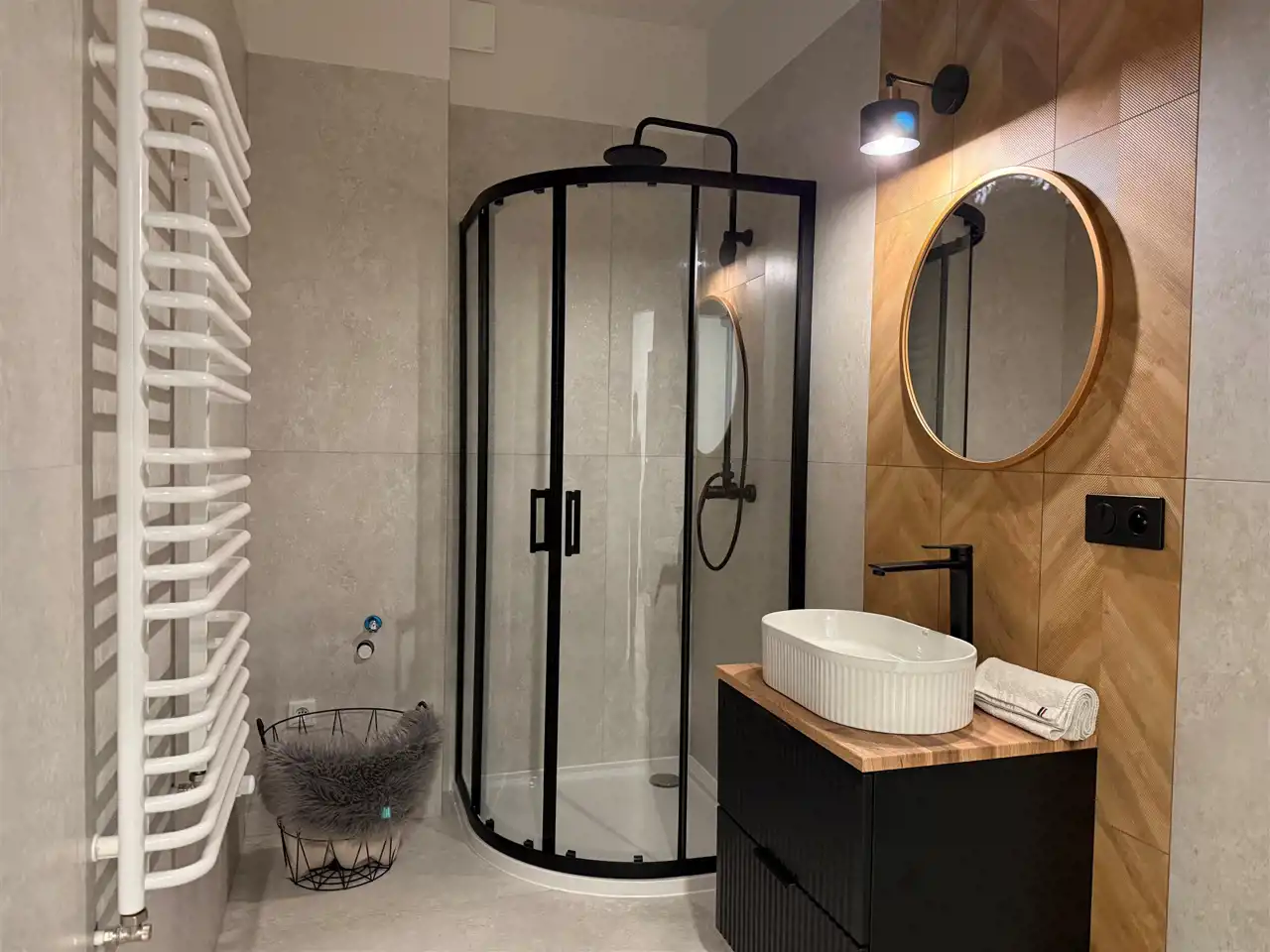 W łazience znajduje się wygodna kabina prysznicowa, ryflowana szafka podumywalkowa z dwiema szufladami oraz miejsce na pralkę.