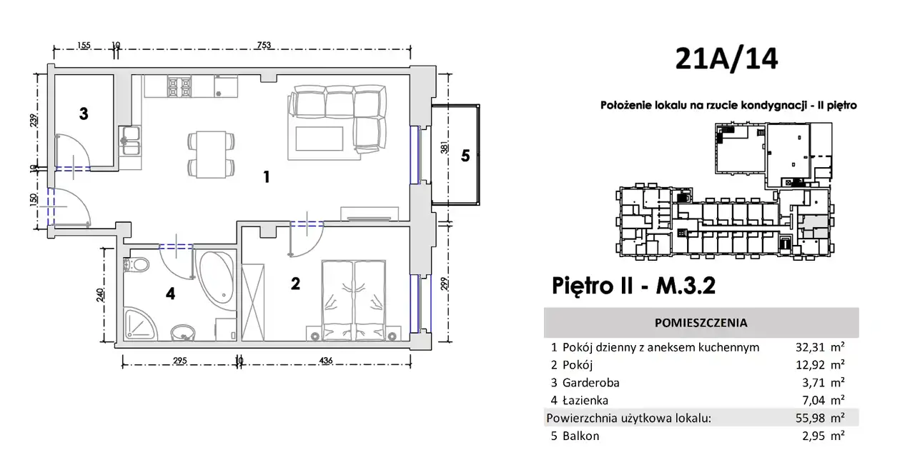 - pokój dzienny z aneksem kuchennym (32,31 m2), z wyjściem na balkon (2,95 m2),