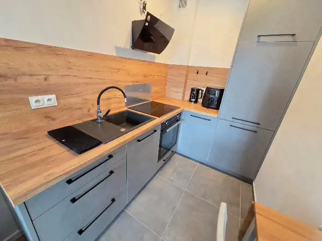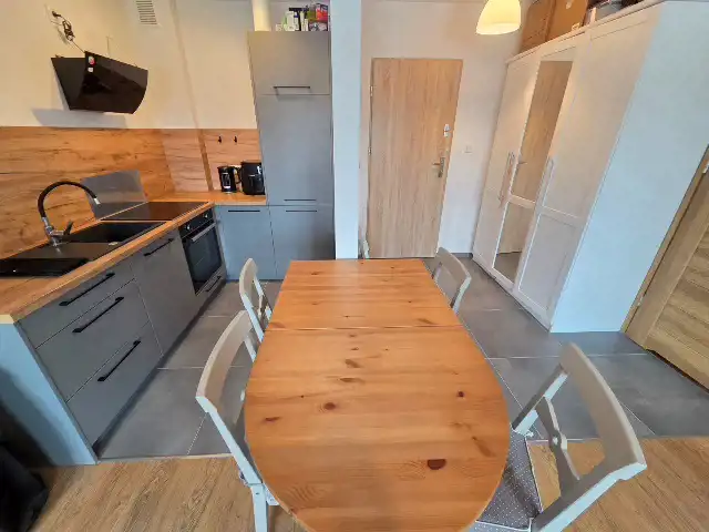 ANEKS KUCHENNY: zabudowa oraz sprzęt AGD (płyta elektryczna, pochłaniacz pary, piekarnik, lodówka), stół z krzesłami.