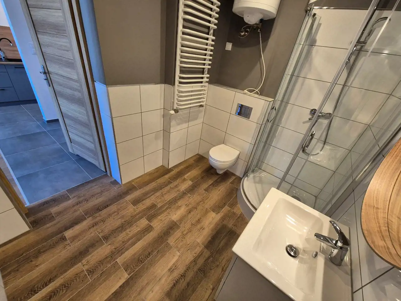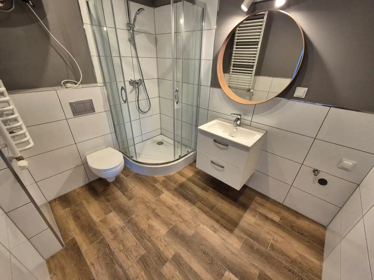ŁAZIENKA: kabina prysznicowa, podwieszana umywalka z szufladami, toaleta, lustro.