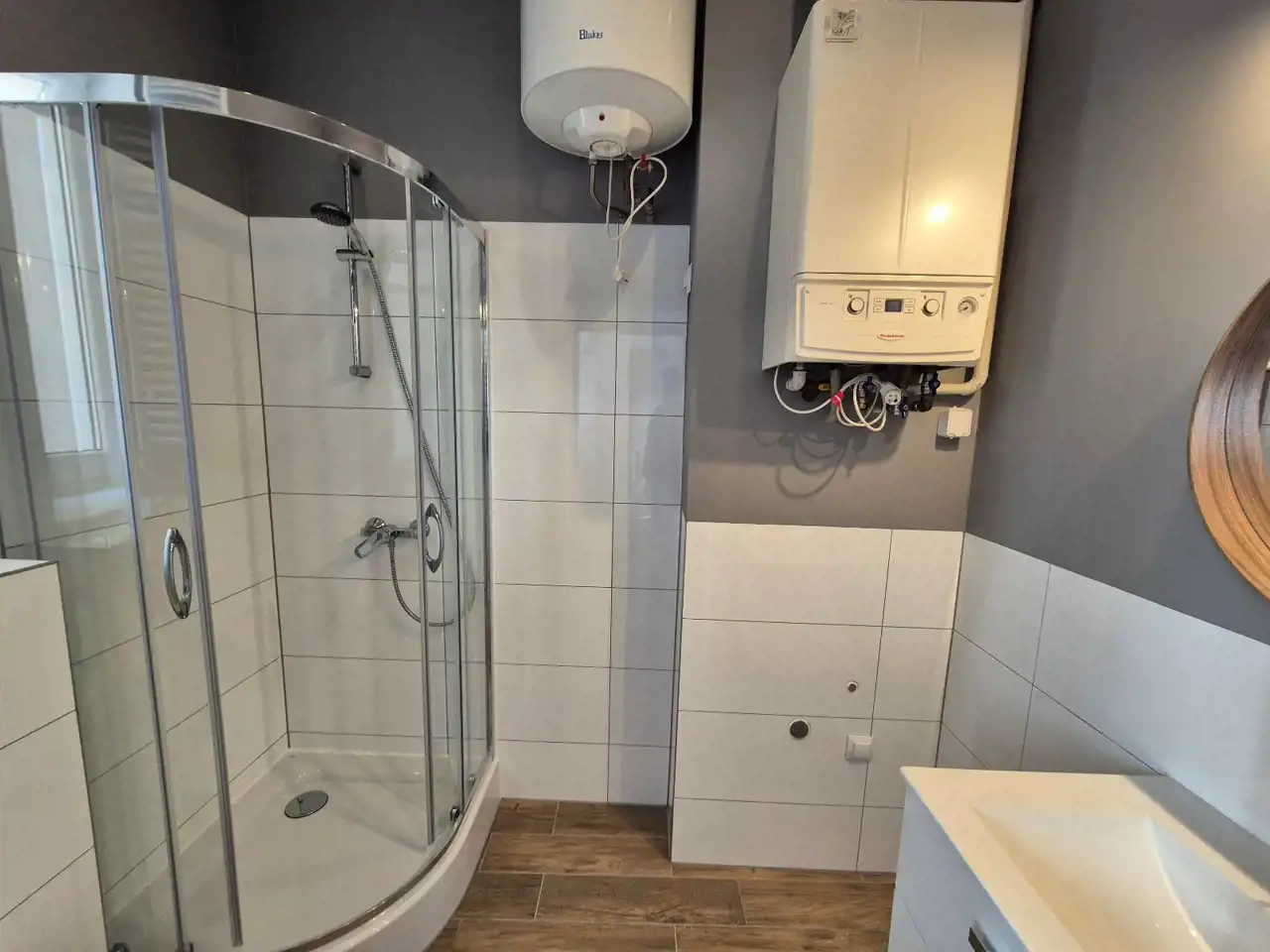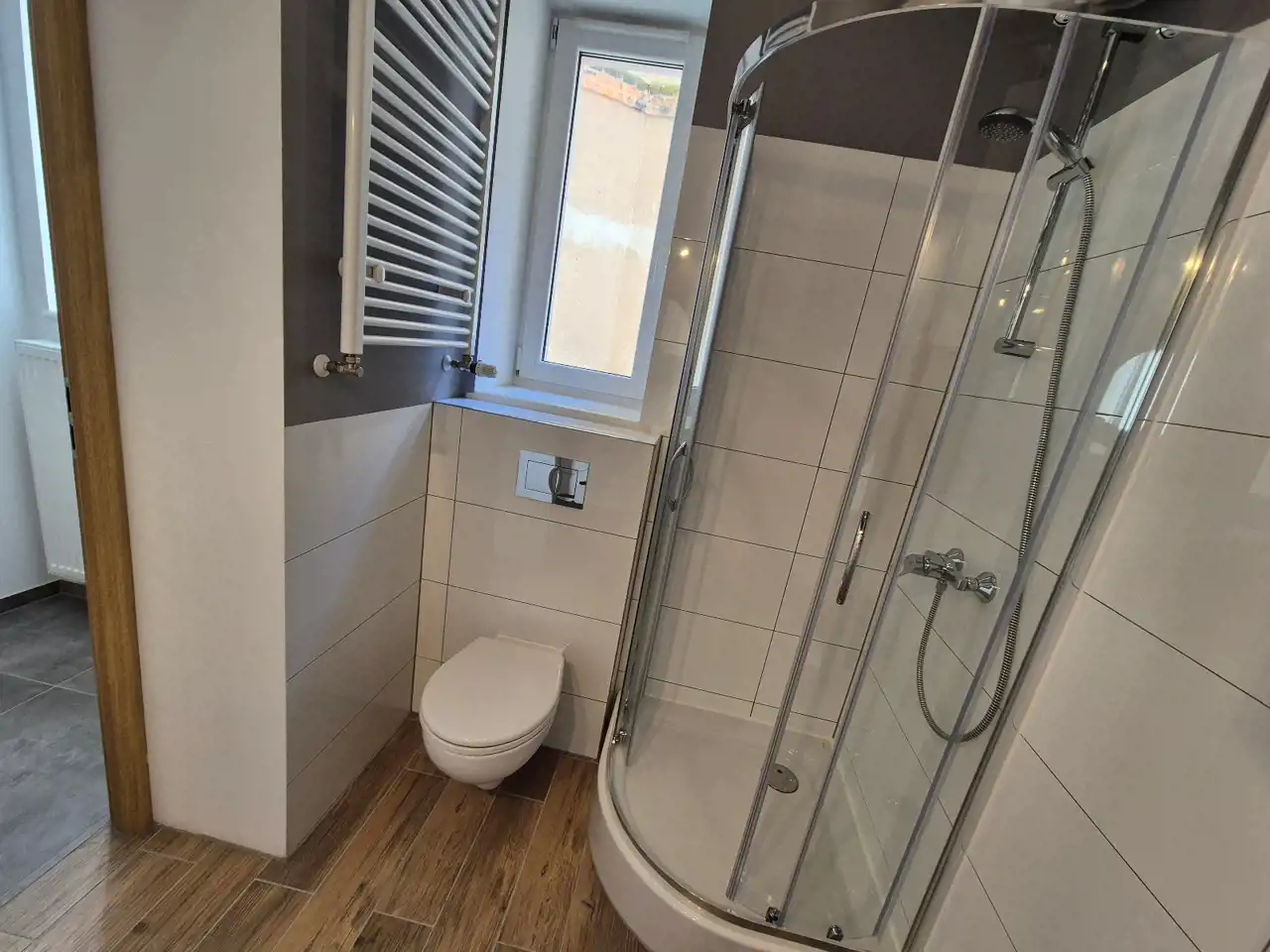 ŁAZIENKA: kabina prysznicowa, podwieszana umywalka z szufladami, toaleta, lustro.