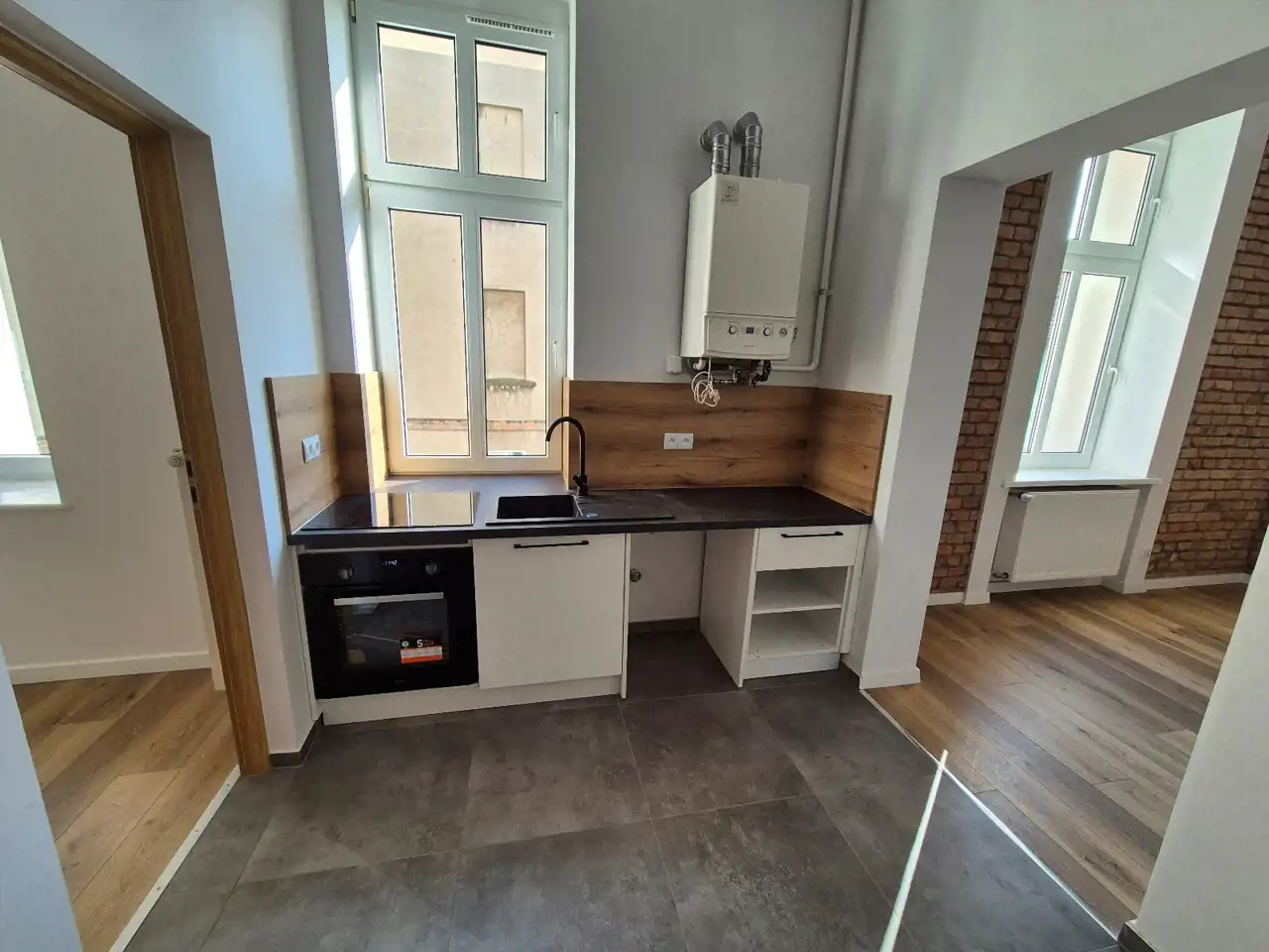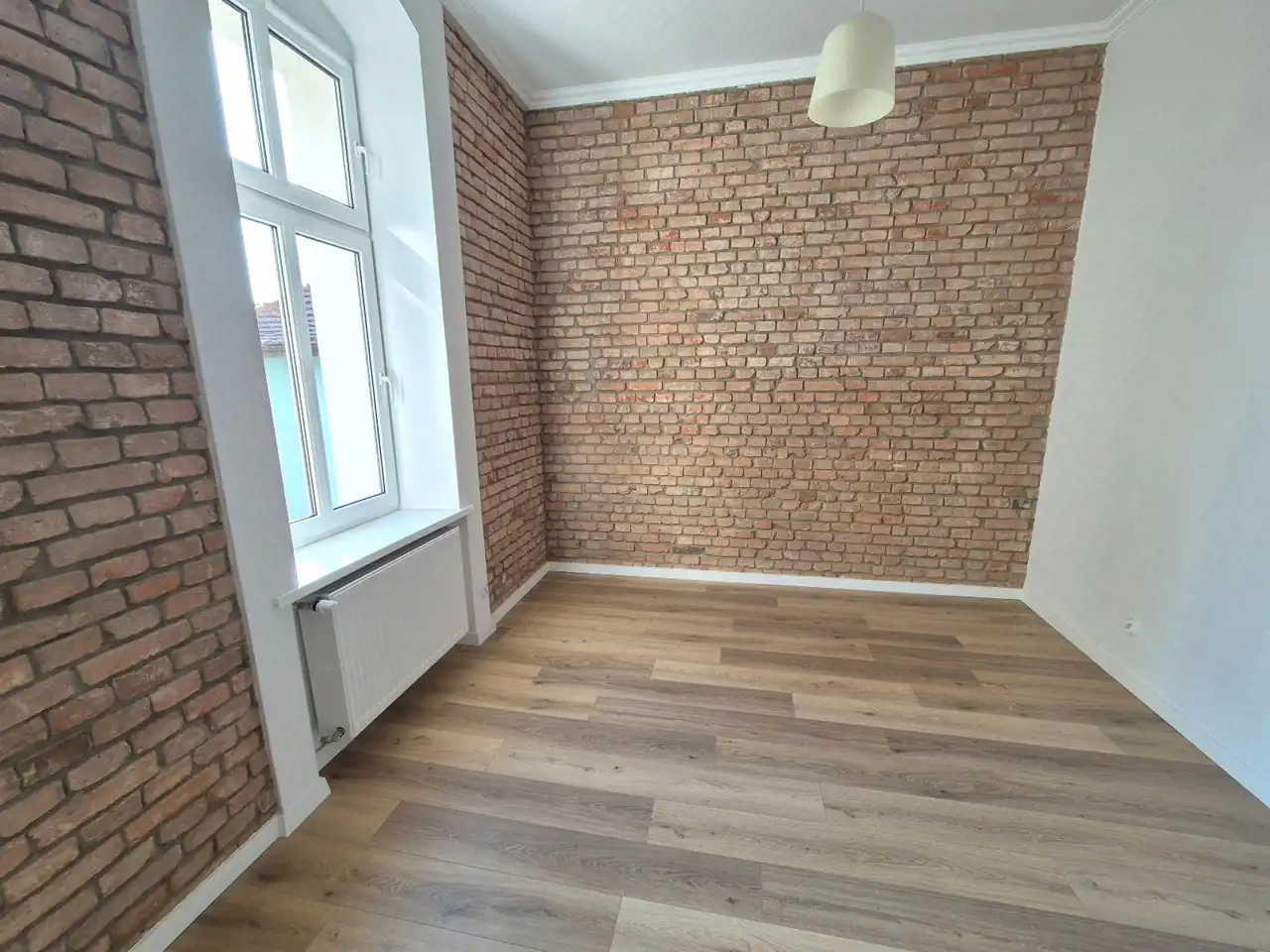 Standard wykończenia: ściany w pokojach malowane na biało oraz częściowo ozdobna cegła, na podłogach panele. Kuchnia i łazienka wyłożone płytkami ceramicznymi. Okna nowe PCV, drzwi wewnętrzne i zewnętrzne nowego typu. Zamontowane pełne oświetlenie pomieszczeń.
