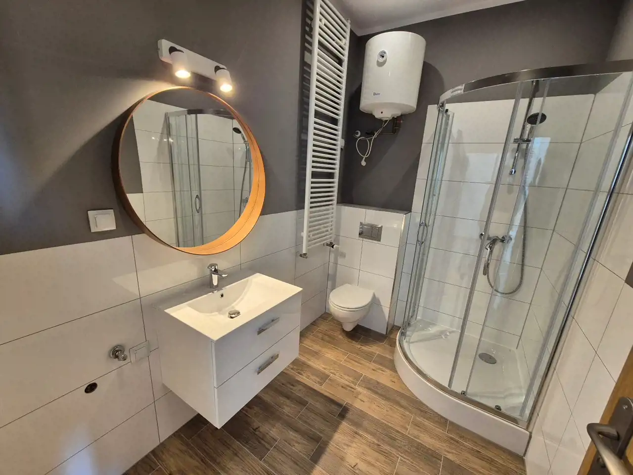 ŁAZIENKA: kabina prysznicowa, podwieszana umywalka z szufladami, toaleta, lustro.