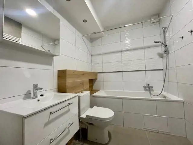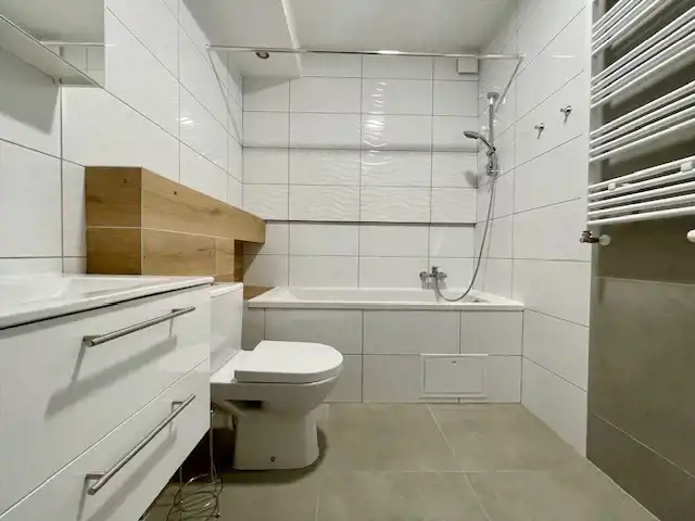 - Łazienka z wanną, umywalką, WC, lustrem oraz grzejnikiem drabinkowym