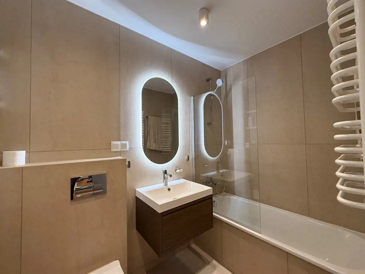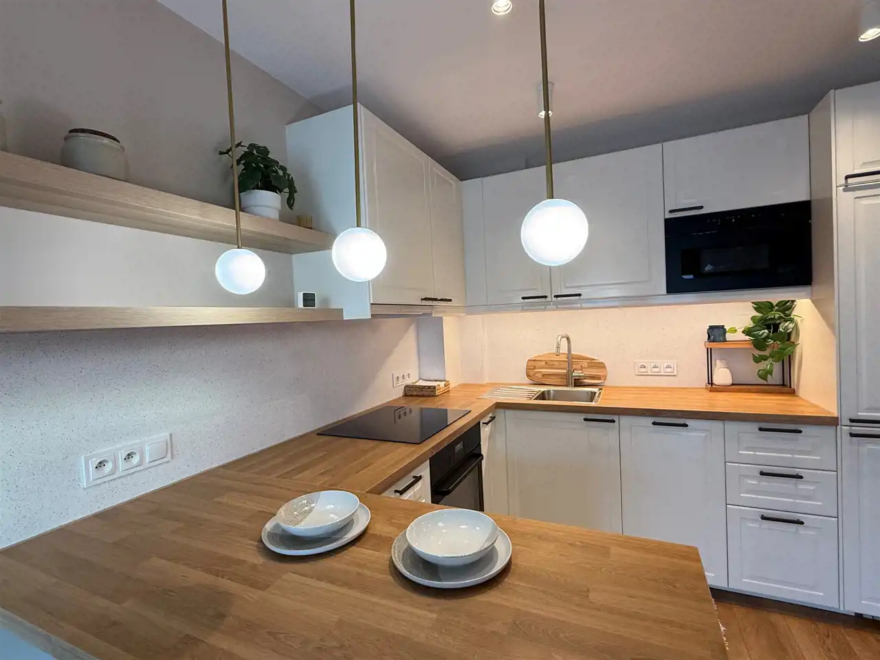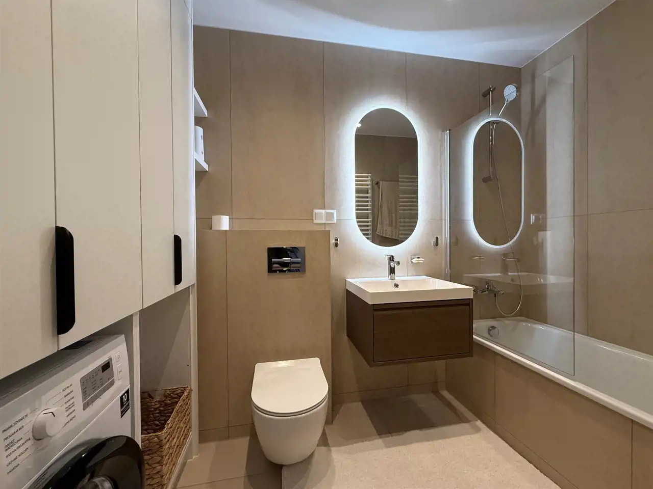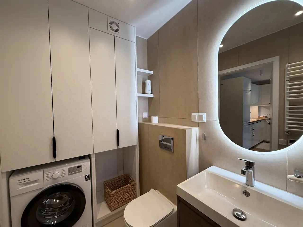 Mieszkanie w pełni umeblowane, w kuchni meble w zabudowie, sprzęt AGD (zmywarka, pralka, pochłaniacz, piekarnik, mikrofala, lodówka), w sypialni szafa w zabudowie, w łazience: szafki, pralka.