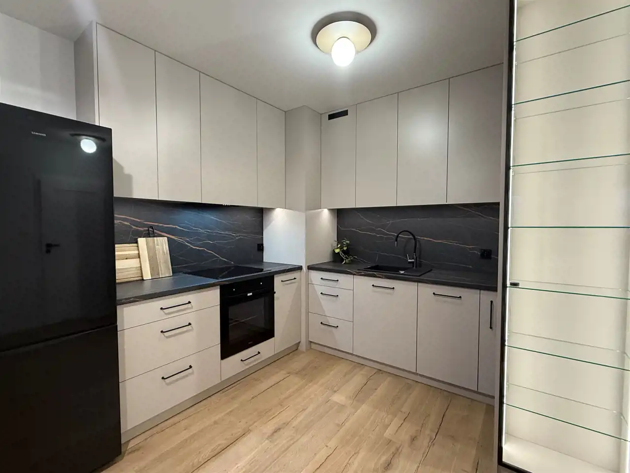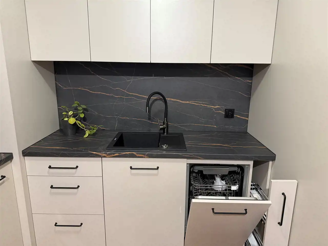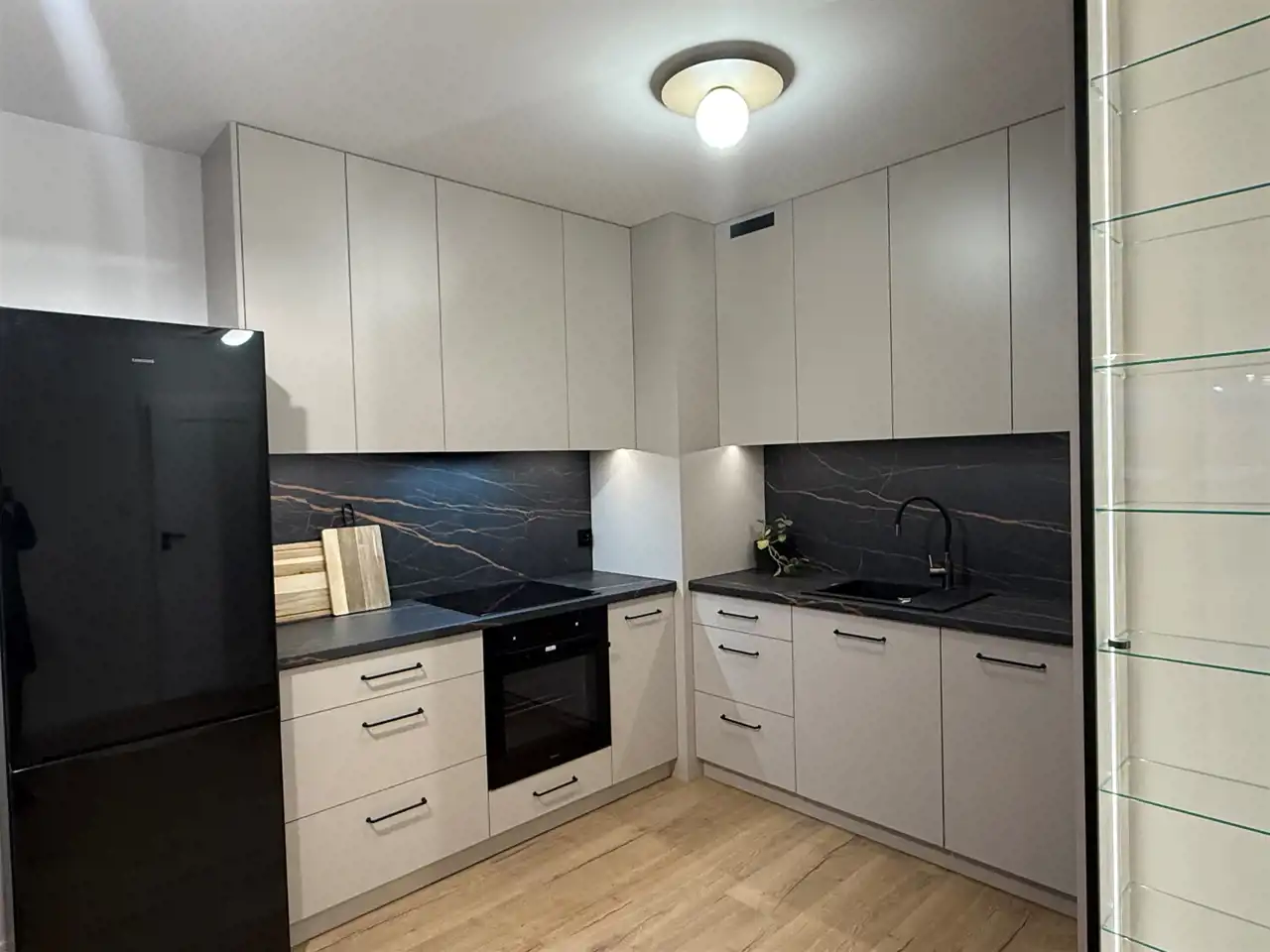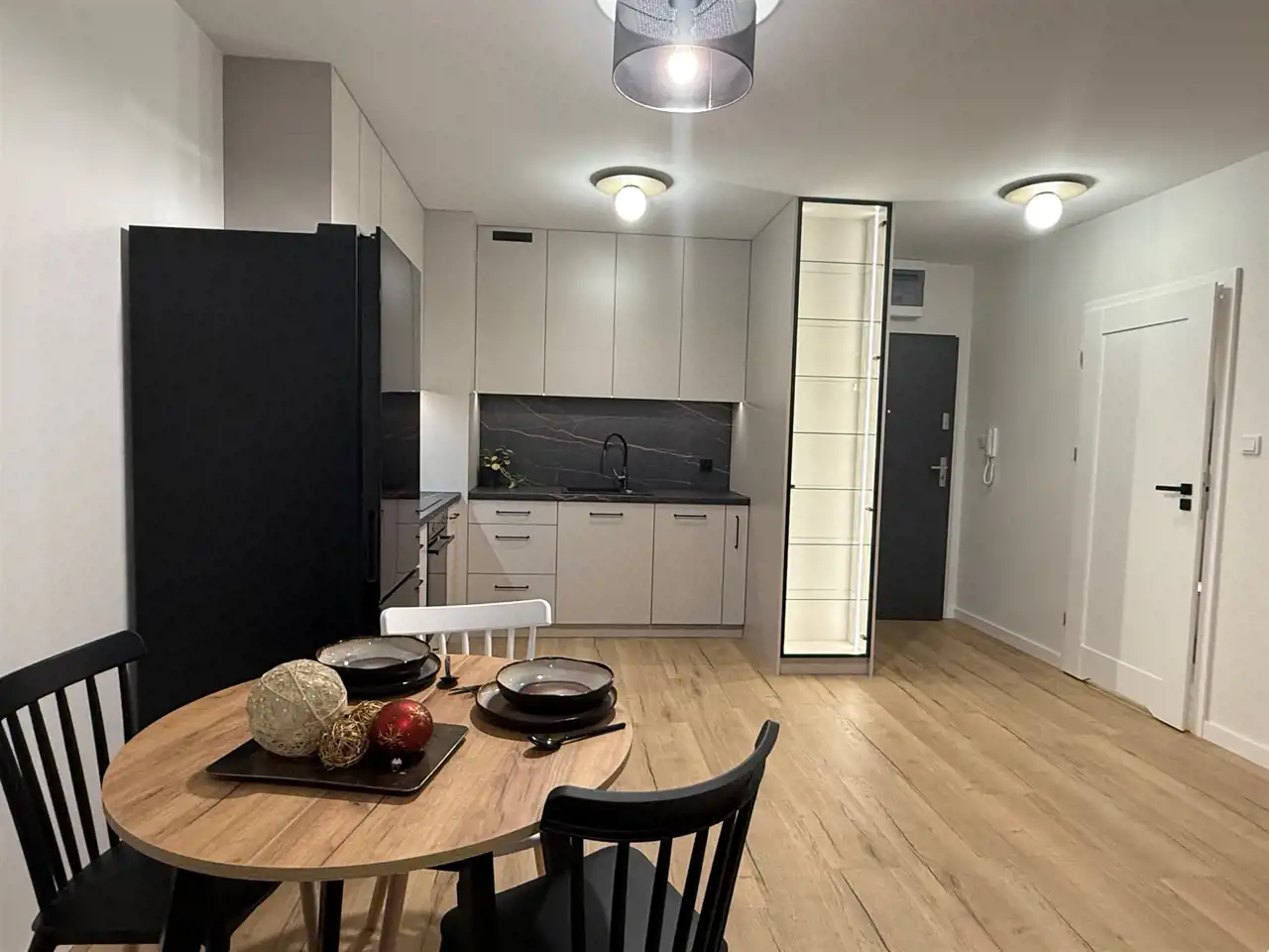 Wyposażenie: zabudowa kuchenna wykonana przez stolarza w modnym kolorze kaszmiru wraz ze sprzętem AGD firmy Samsung (płyta indukcyjna, piekarnik, zmywarka, duża lodówka oraz okap), duża podświetlana, przeszklona szafa, w przedpokoju pojemna szafa, w sypialni duża szafa w zabudowie i wygodne łóżko, w salonie kanapa, stół i krzesła, łazienka również w pełni urządzona – armatura Deante