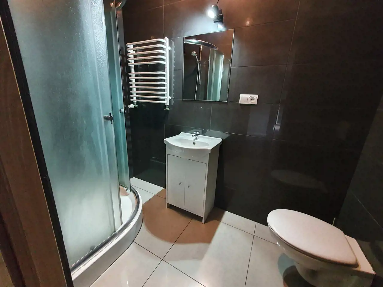 ŁAZIENKA: kabina prysznicowa, umywalka z szafką, toaleta, lustro.