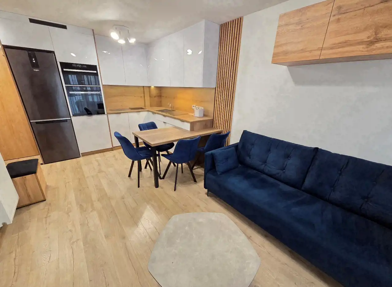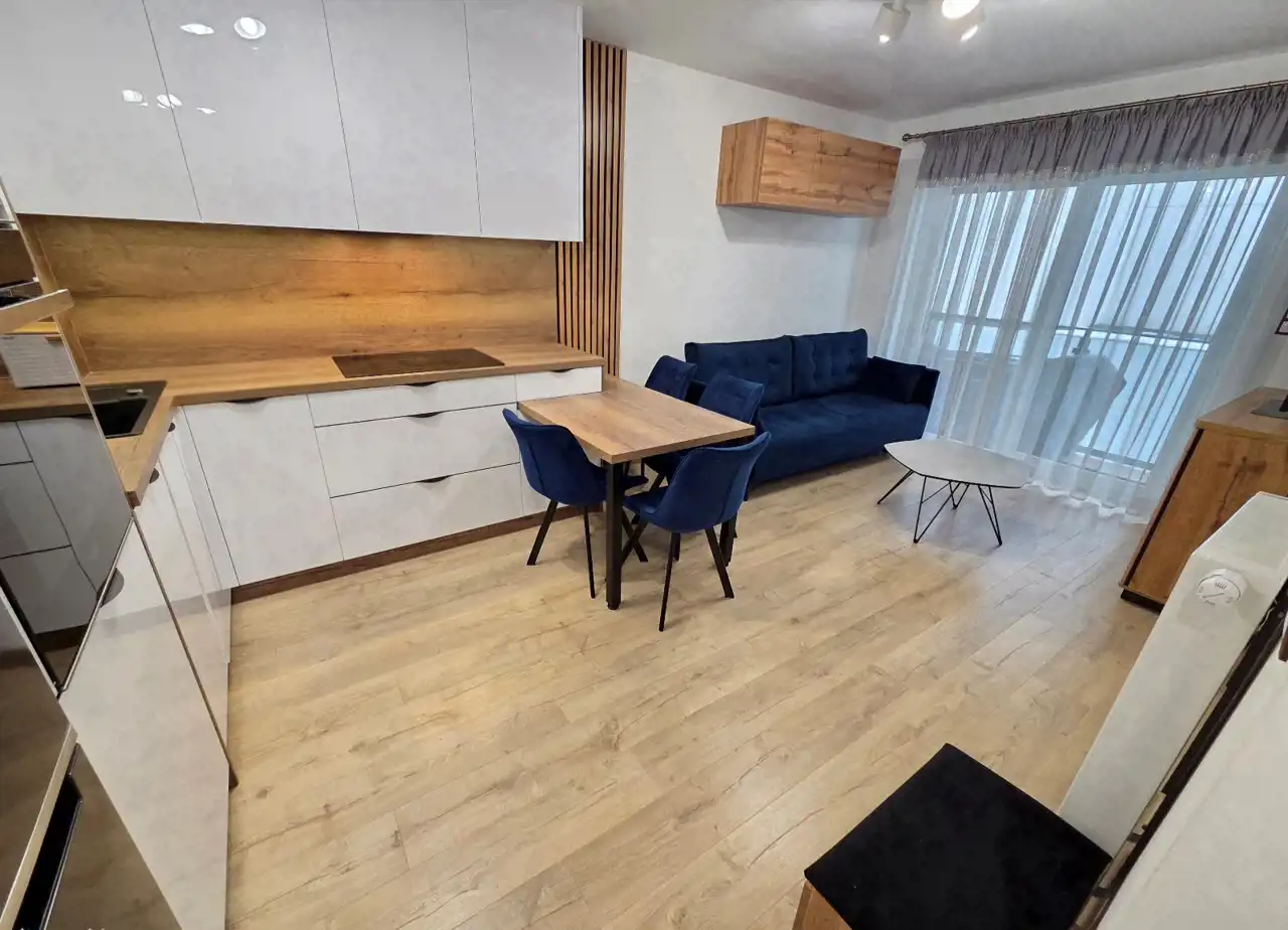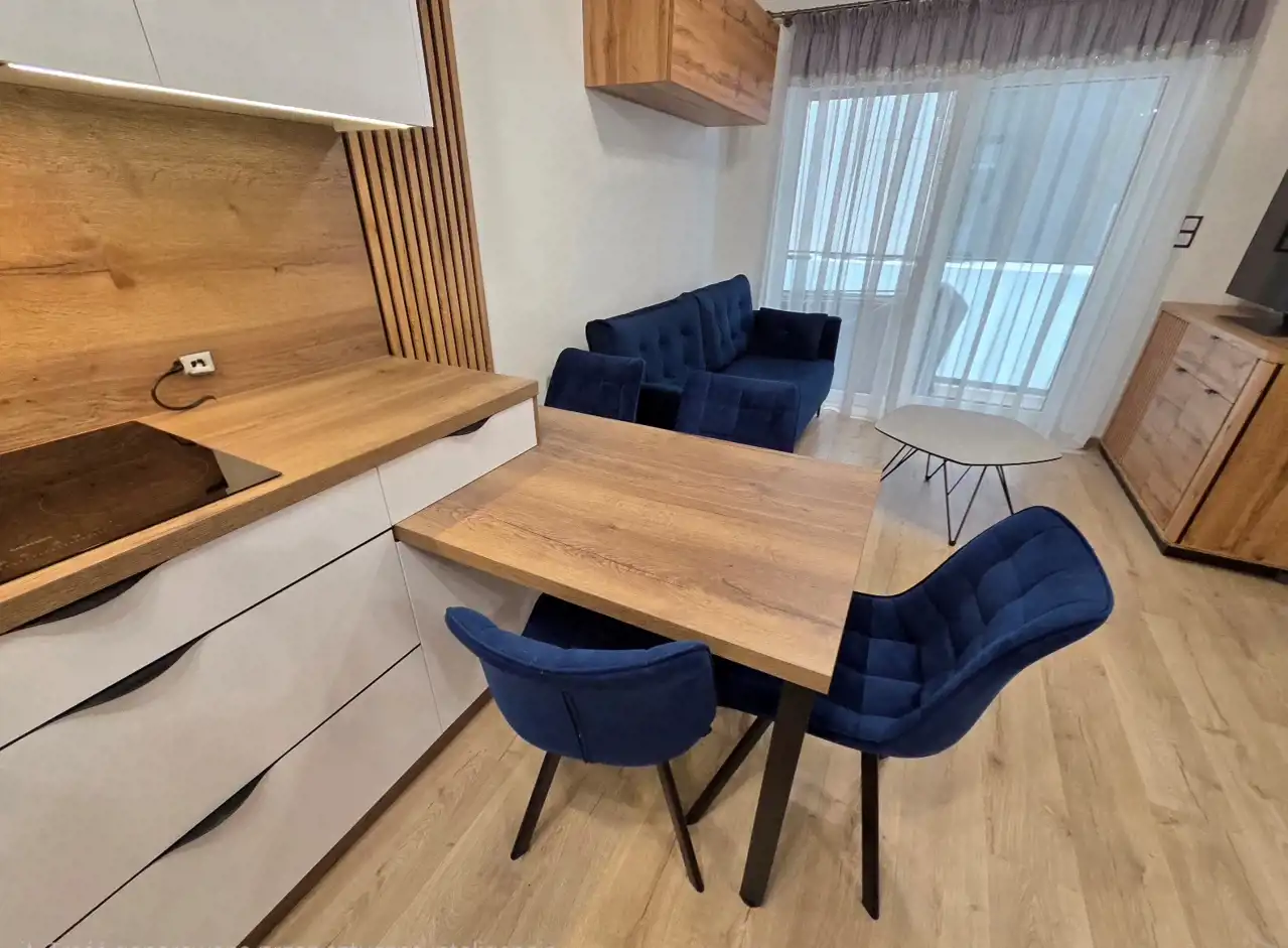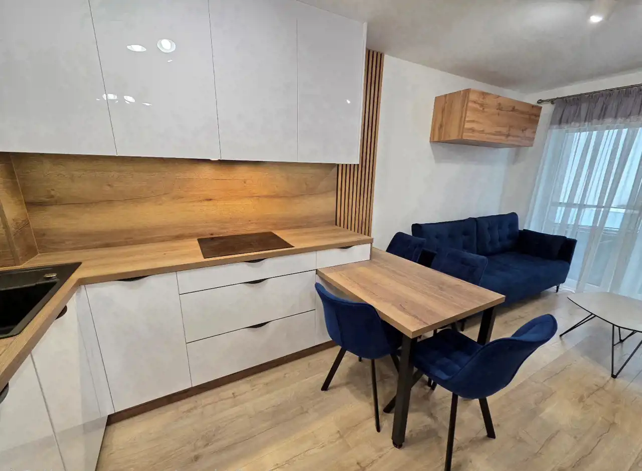 - salon z aneksem kuchennym, z wyjściem na balkon.