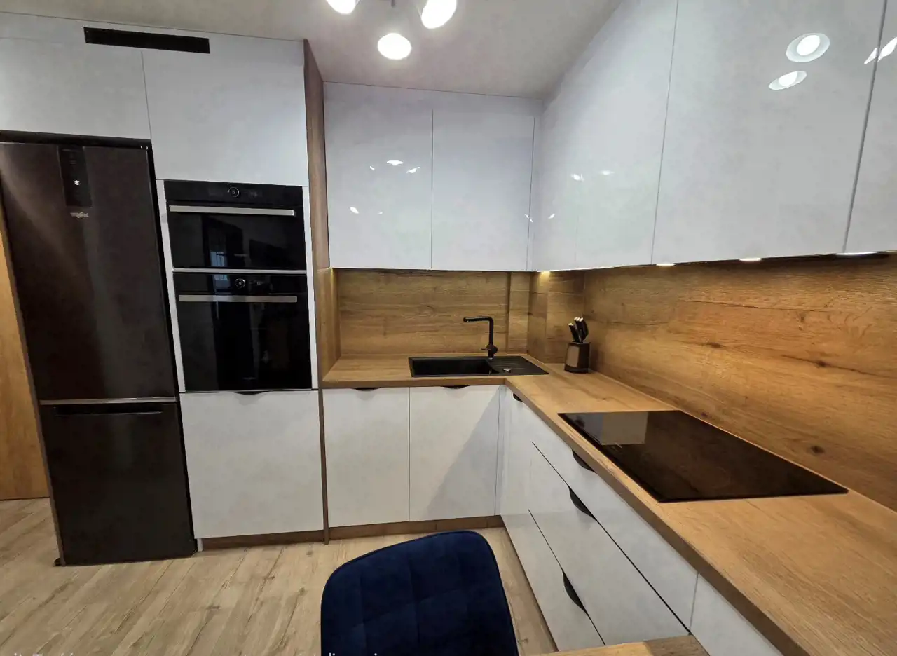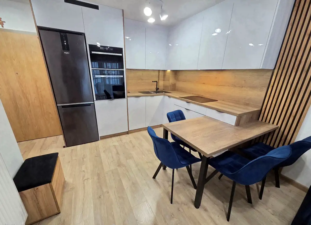 ANEKS KUCHENNY: stół z krzesłami. zabudowa oraz sprzęt AGD (lodówko - zamrażarka, płyta elektryczna, piekarnik, zmywarka, kuchenka mikrofalowa, okap, pralko - suszarka).