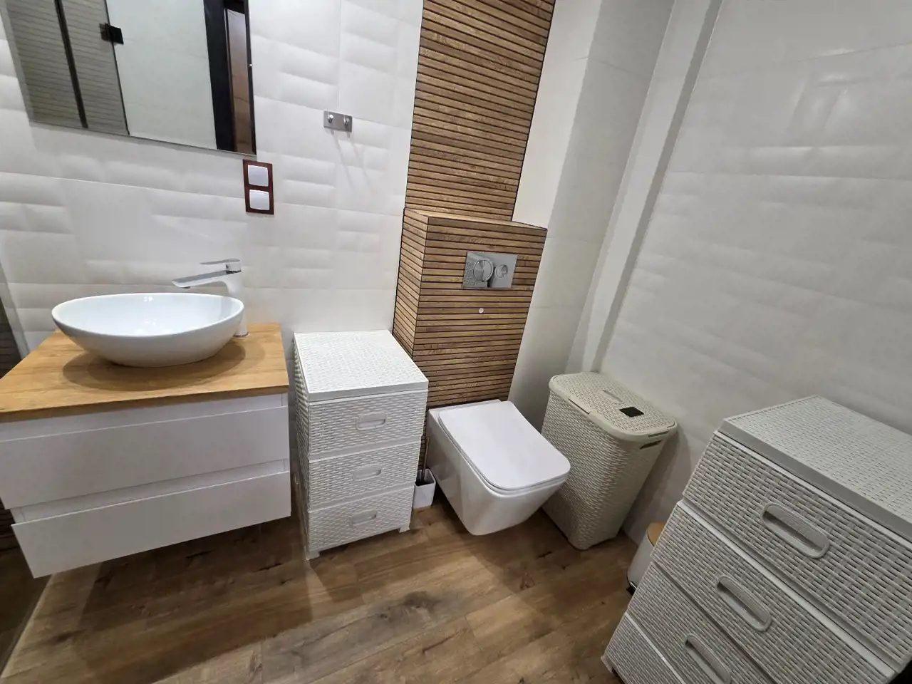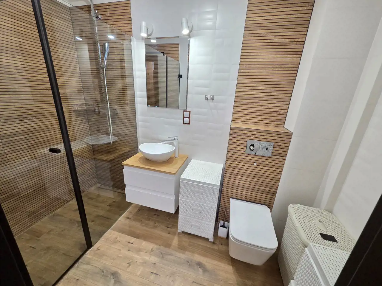 ŁAZIENKA: kabina prysznicowa, nablatowa umywalka z podwieszanymi szufladami, toaleta.