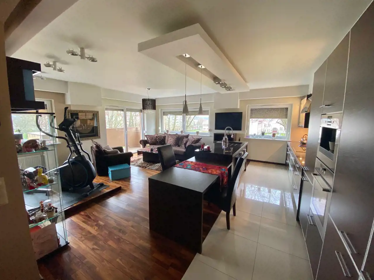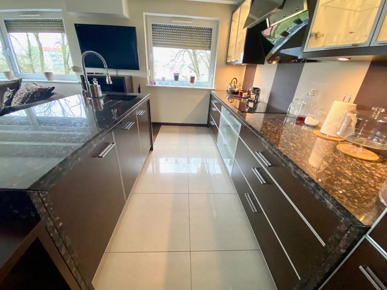 Cena obejmuje meble widoczne na zdjęciach wraz ze sprzętami AGD (kawiarka, piekarnik, kuchenka elektryczna, zmywarka, okap, lodówka z zamrażarką).