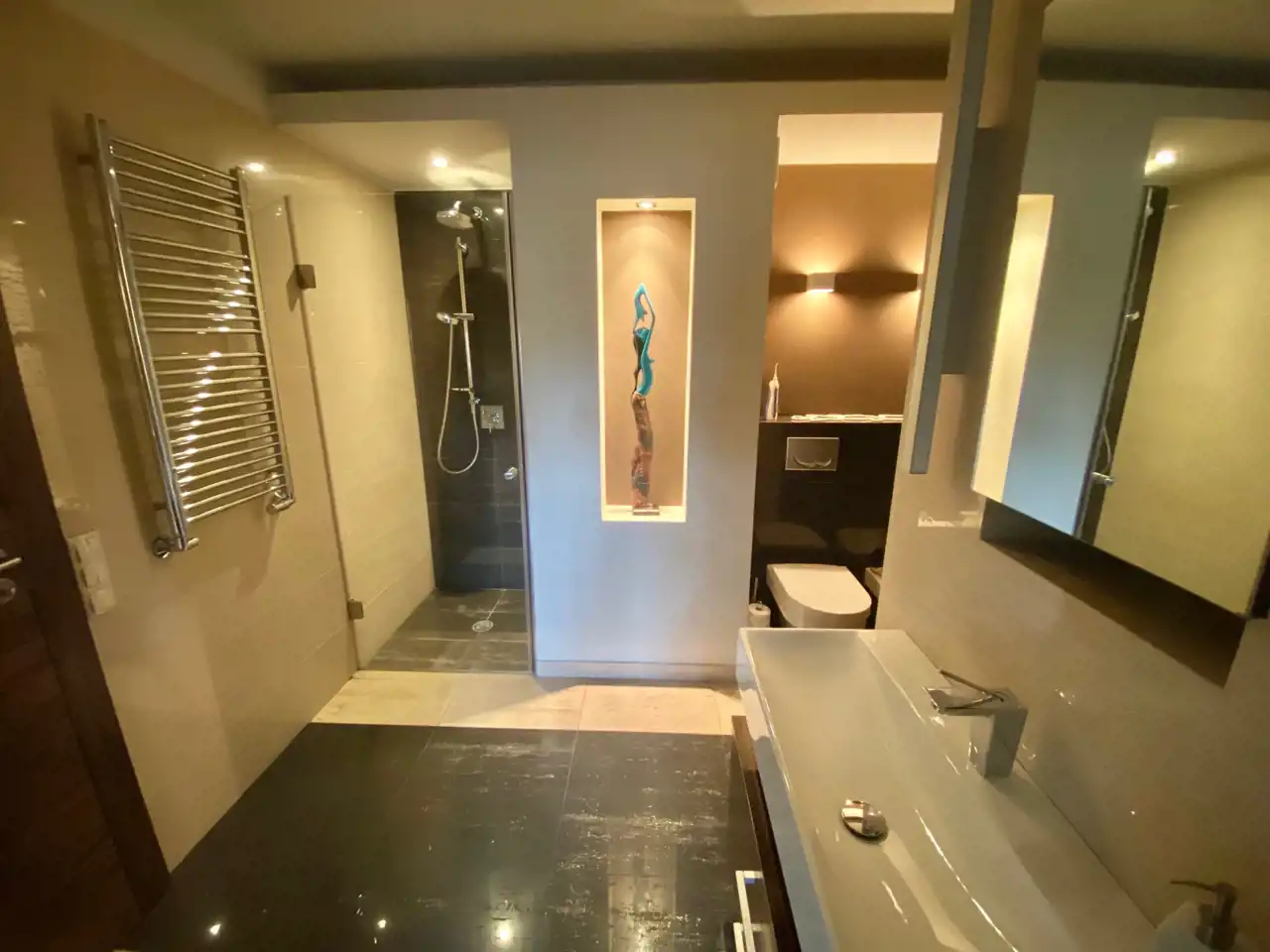 - W łazience duża kabina prysznicowa oraz WC, bidet, umywalka. We wnęce miejsce na pralkę.