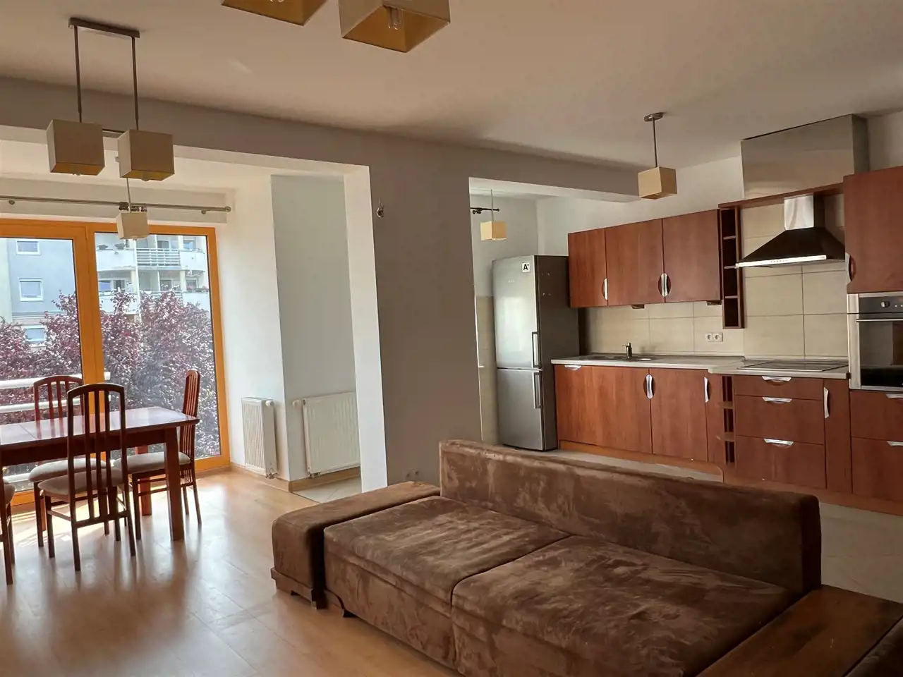 Mieszkanie częściowo umeblowane, posiada zabudowę kuchenną wraz ze sprzętem AGD (lodówka z zamrażalką, płyta ceramiczna, piekarnik, zmywarka), w pokojach meble, kanapy, łóżka, w przedpokoju duża szafa w zabudowie.