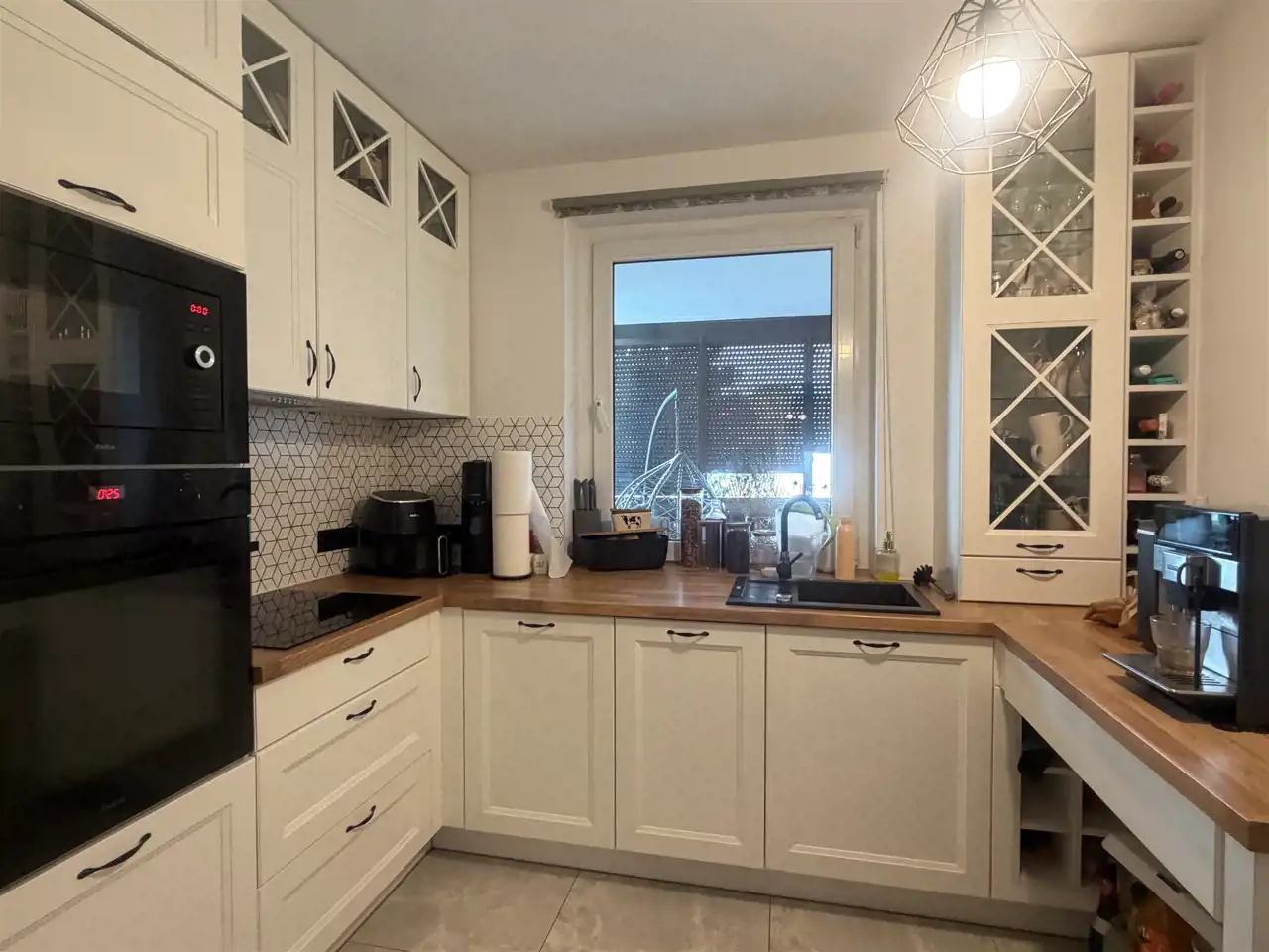 Mieszkanie jest częściowo umeblowane i gotowe do zamieszkania. Kuchnia wyposażona w zabudowę oraz sprzęt AGD: lodówkę z zamrażalką, płytę ceramiczną, piekarnik, mikrofalę oraz zmywarkę.