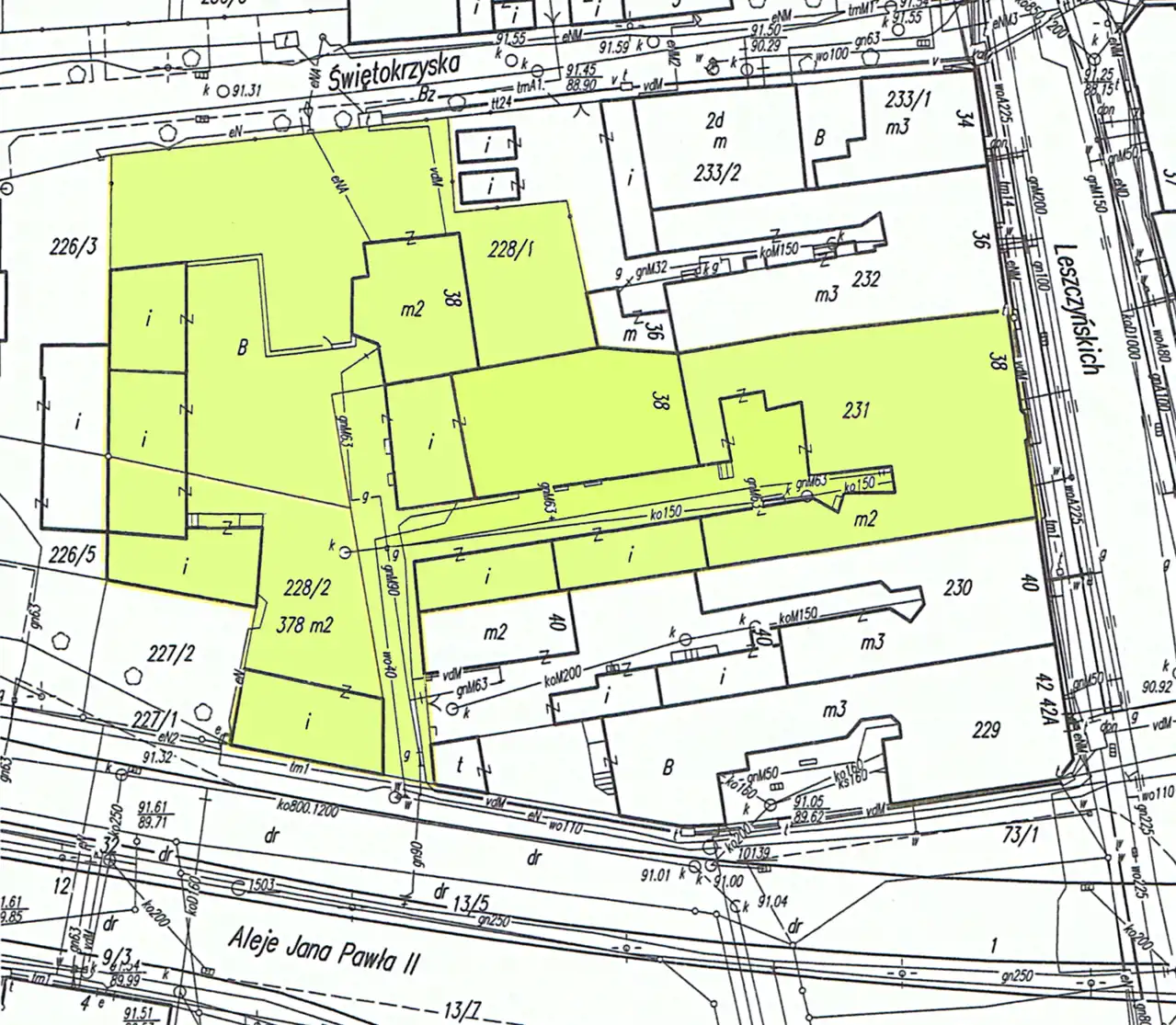 Wjazd na teren posesji z dwóch stron – od ul. Jana Pawła II i ul. Świętokrzyskiej.