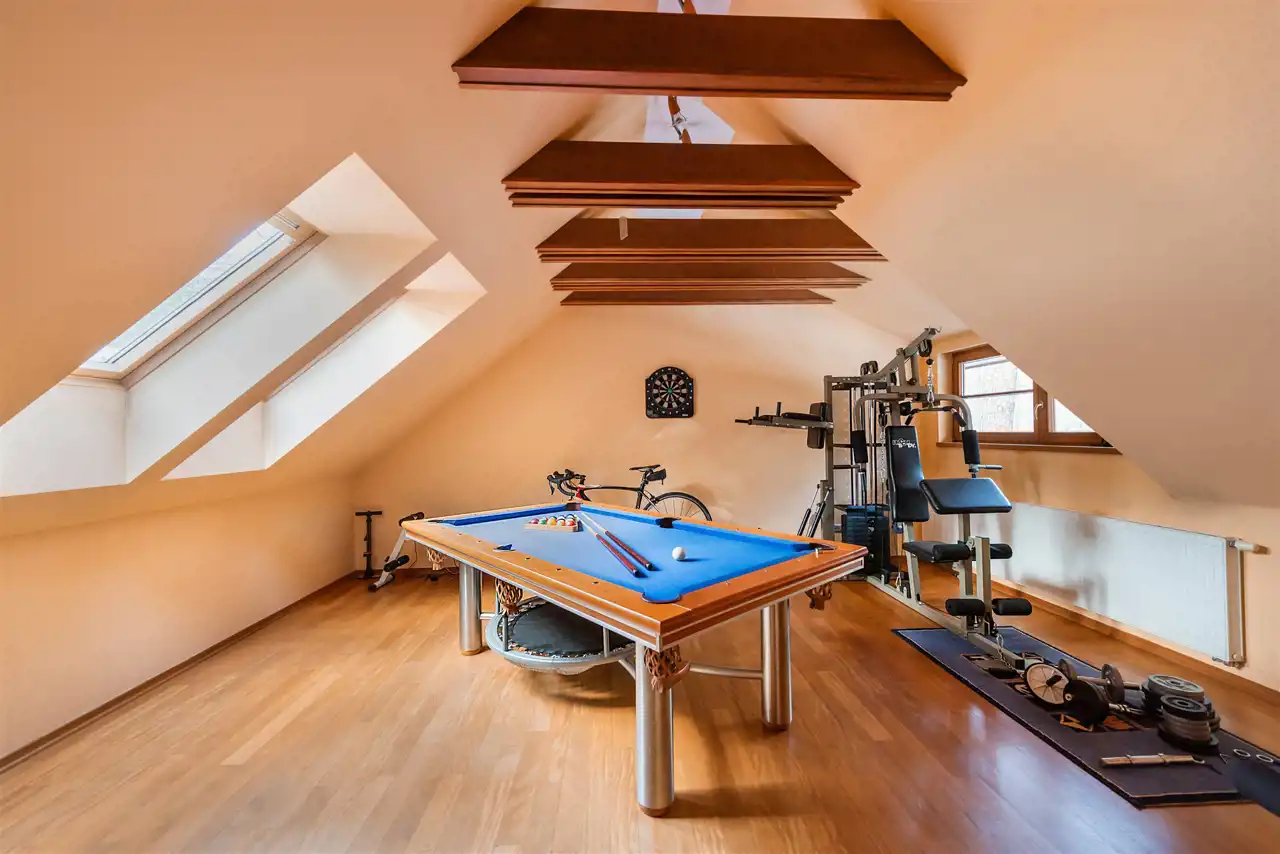 - duże, otwarte pomieszczenie pełniące obecnie funkcję pokoju bilardowego oraz siłowni - przestrzeń o dużym potencjale aranżacyjnym