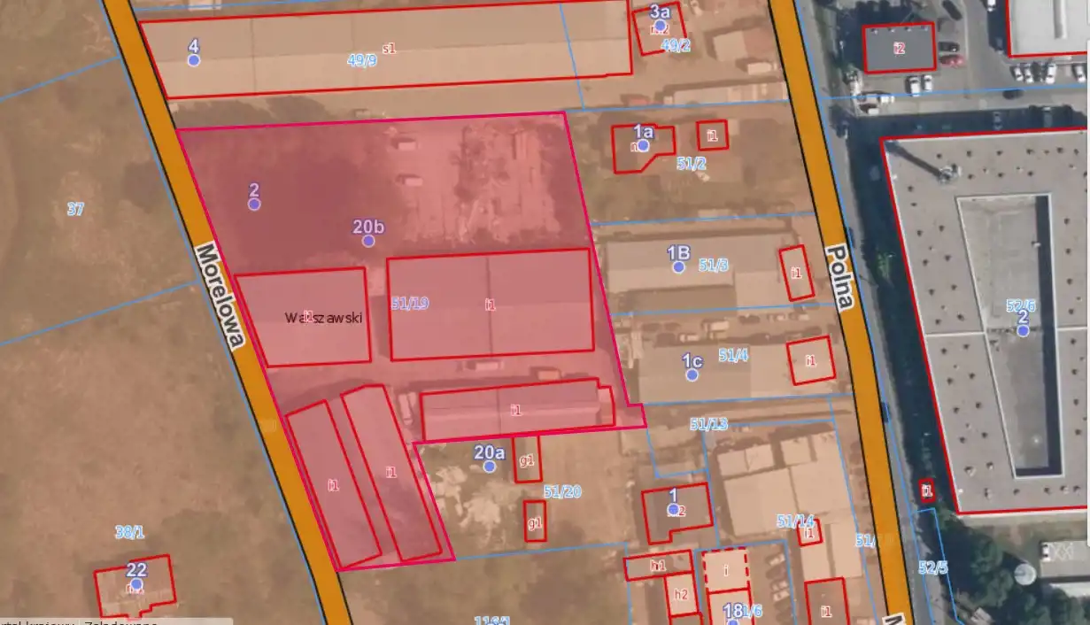 Powierzchnia działki 7599m2. Dojazd do działki z dwóch stron. Od ulicy Polnej i ulicy Morelowej. Działka obecnie zabudowana wiatami magazynowymi. Na działce znajduje się staw. Cena obejmuje cenę gruntu, wraz z drogą wjazdową od ulicy Polnej (powierzchnia 404m2) i dodatkowo w cenie działka nr 36 bez prawa do zabudowy ( łąka). Łączna powierzchnia wynosi 1,0303 HA. Zakup bez zgody KOWR. MPZP wydane.