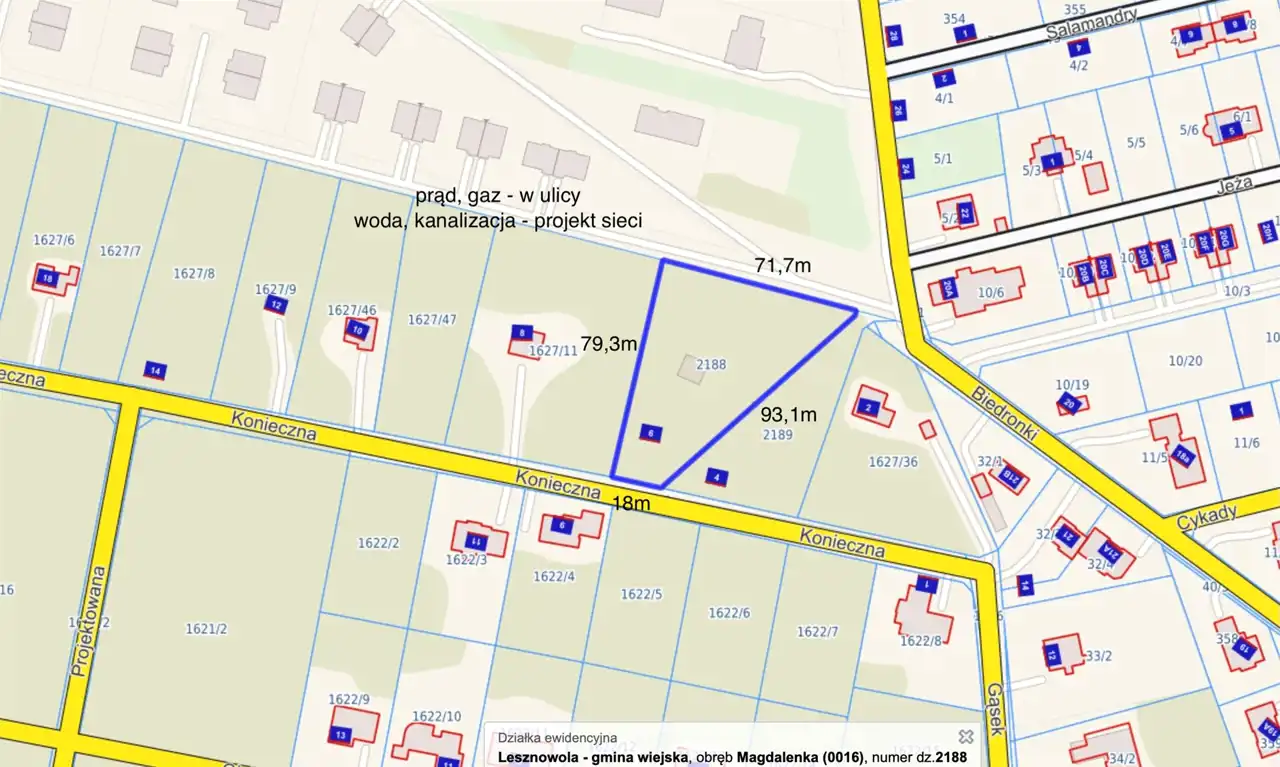 - Media Woda: w trakcie prowadzenia; Kanalizacja: w trakcie prowadzenia; Prąd: w ulicy; Gaz: w ulicy