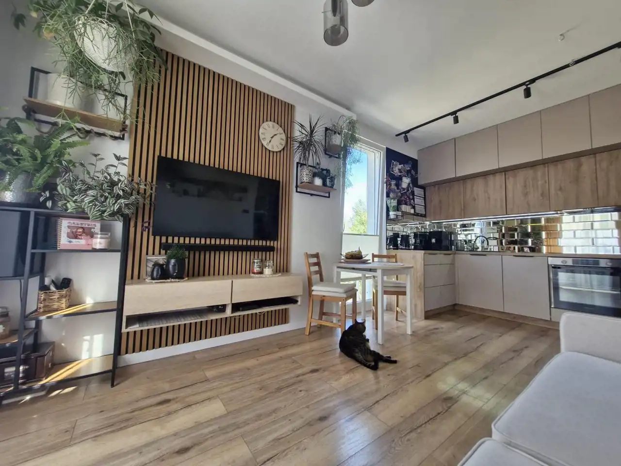 przestronny salon z nowoczesnym aneksem kuchennym