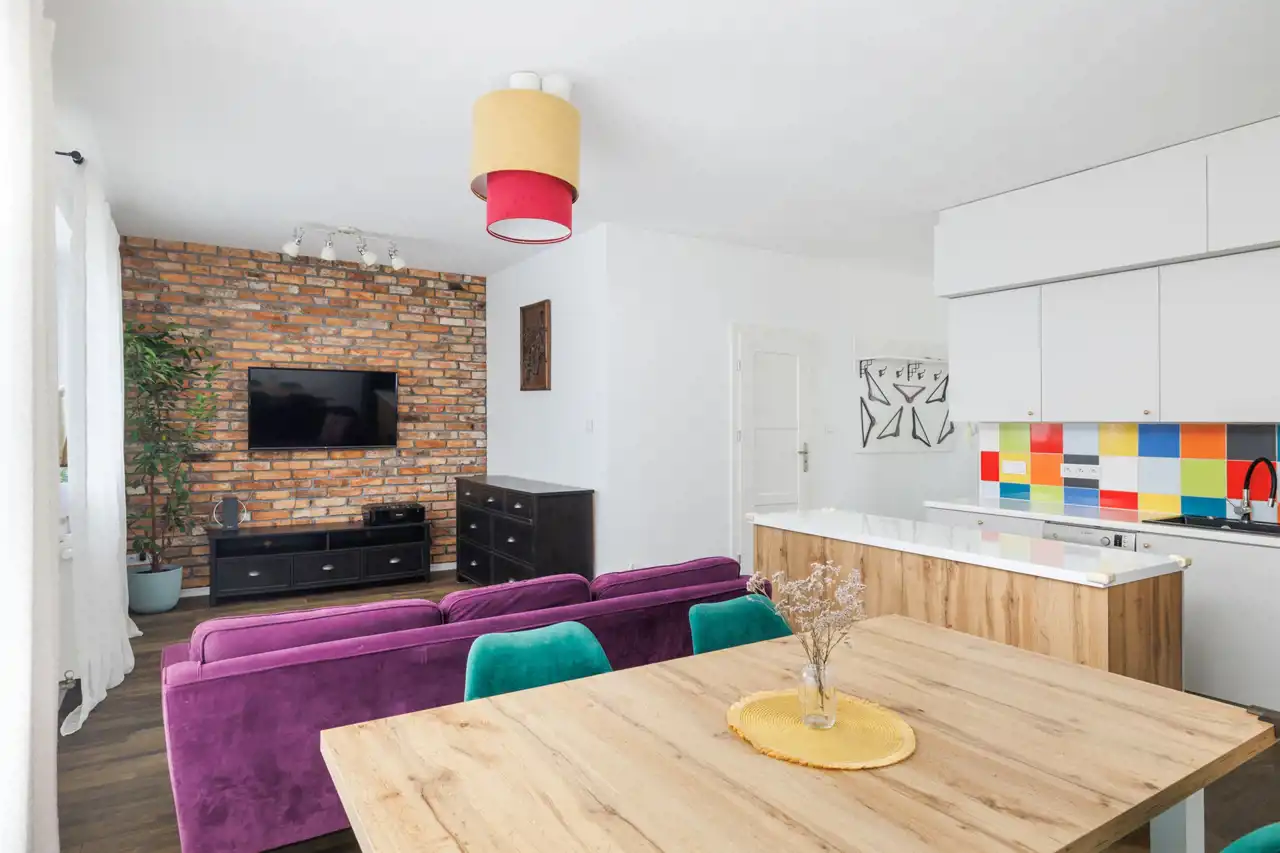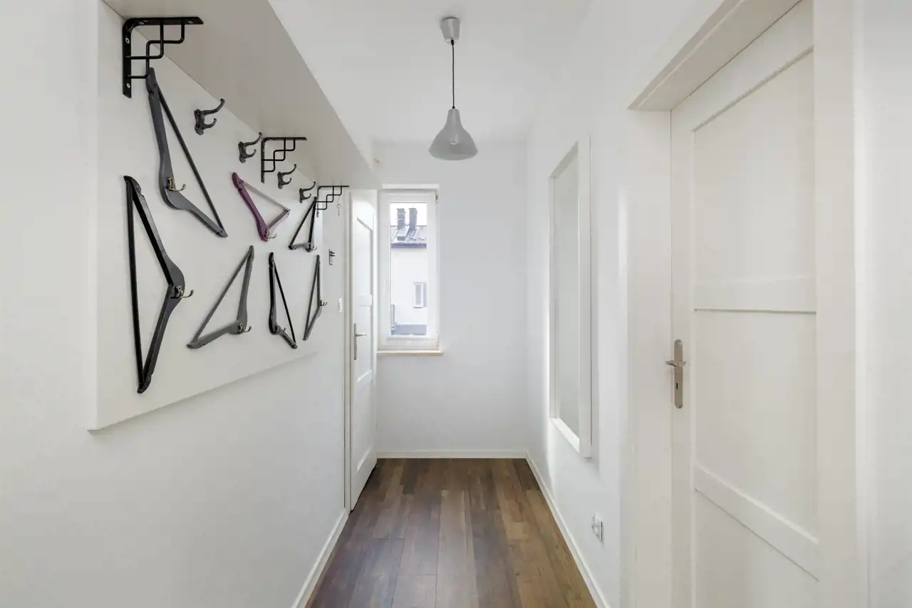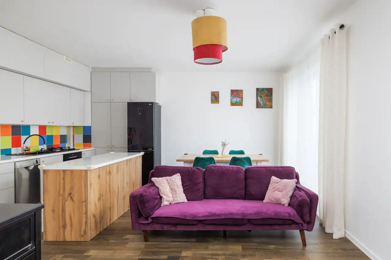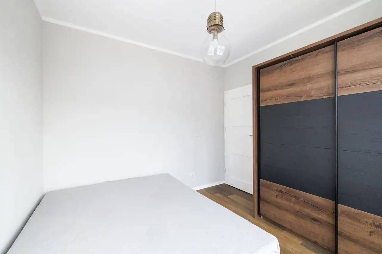 Mieszkanie jest w pełni wyposażone i gotowe do zamieszkania. Aneks kuchenny został zabudowany meblami wykonanymi na wymiar i wyposażony w sprzęt AGD: lodówkę, zmywarkę, płytę gazową oraz okap.