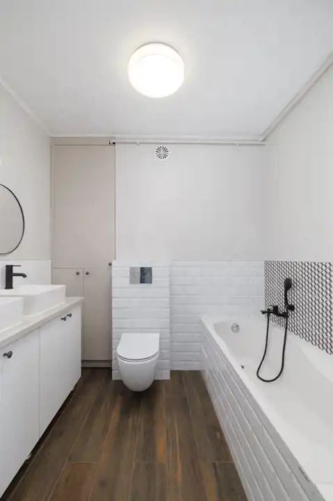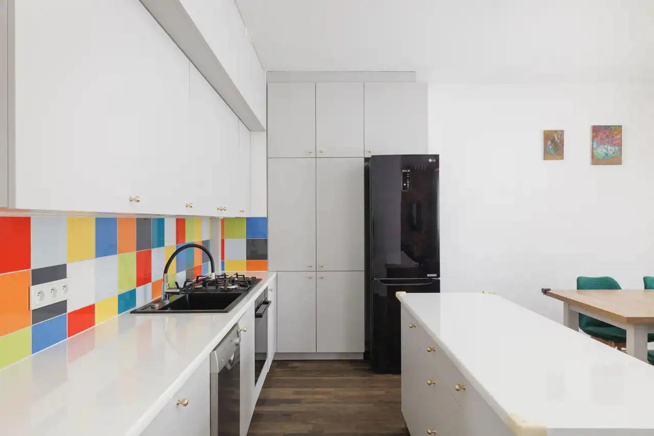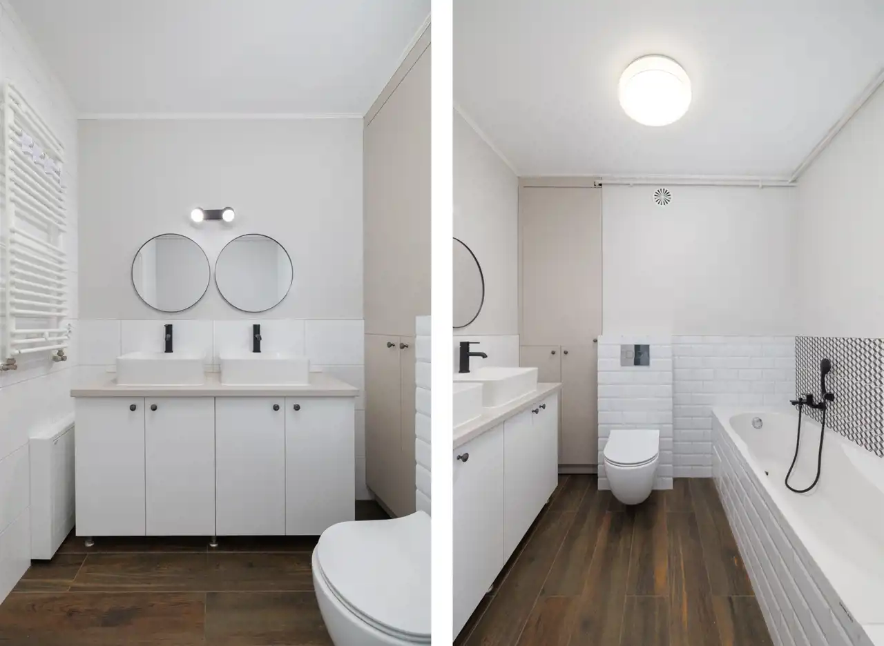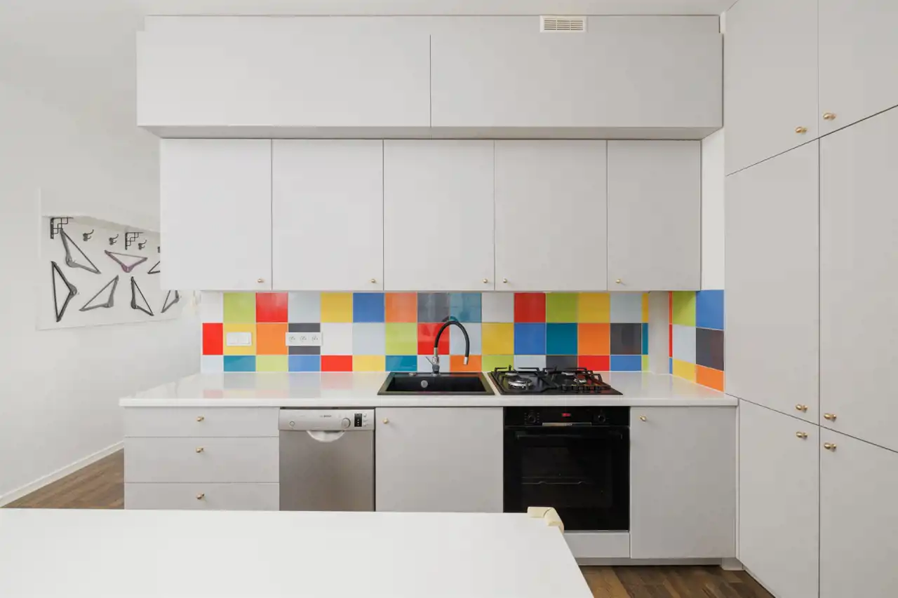 Mieszkanie jest w pełni wyposażone i gotowe do zamieszkania. Aneks kuchenny został zabudowany meblami wykonanymi na wymiar i wyposażony w sprzęt AGD: lodówkę, zmywarkę, płytę gazową oraz okap.