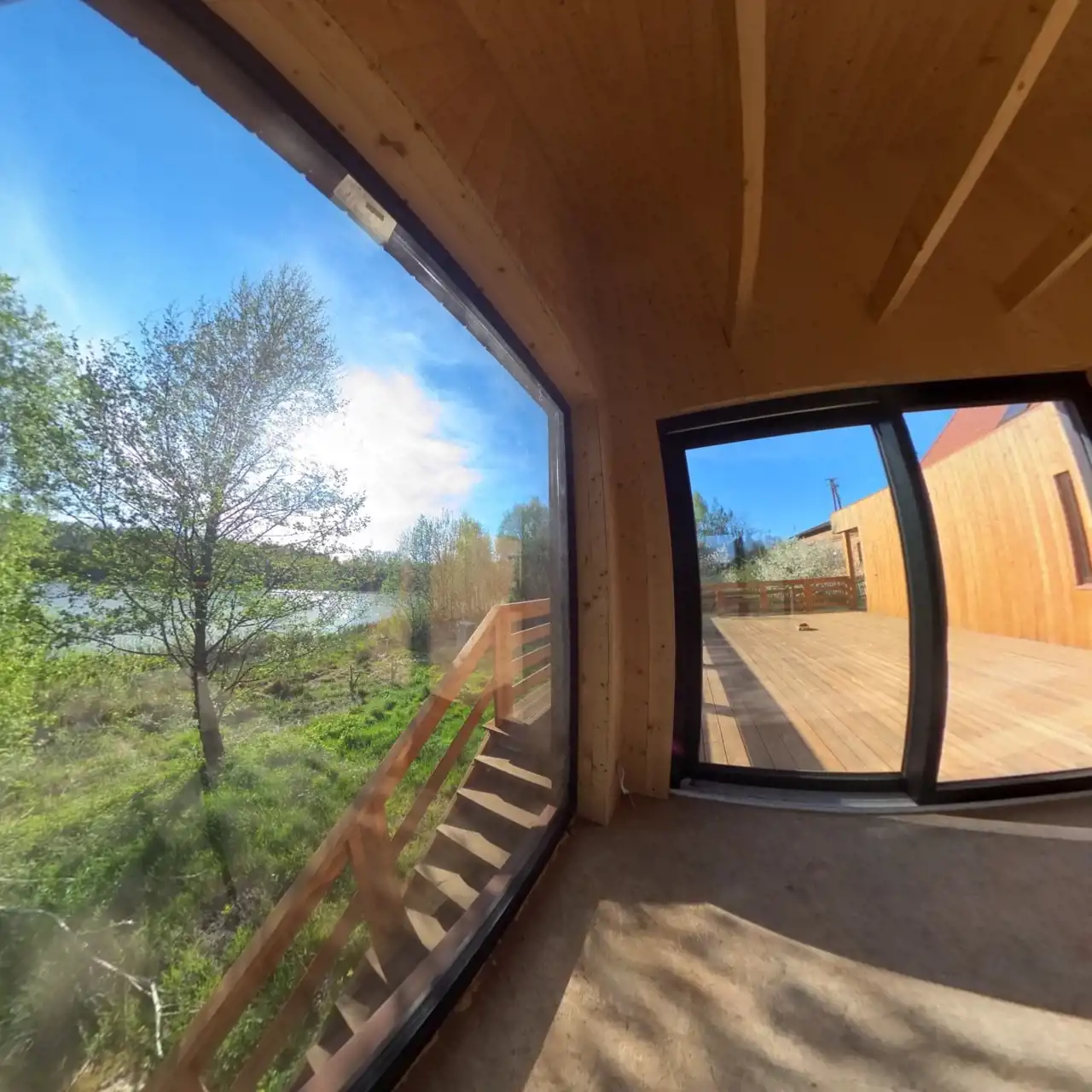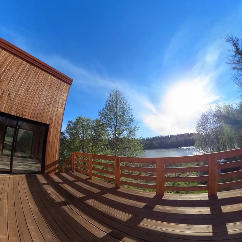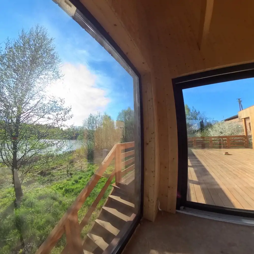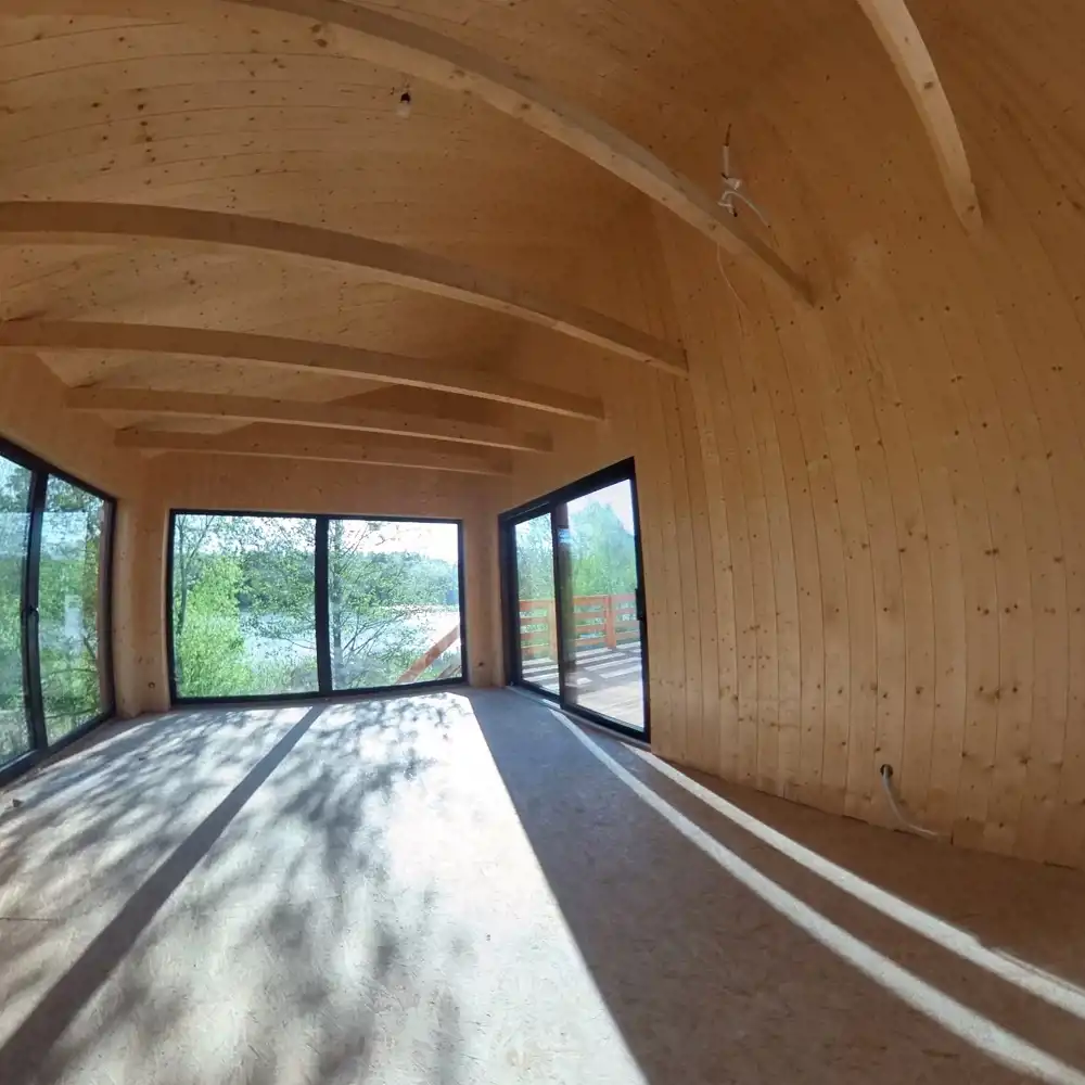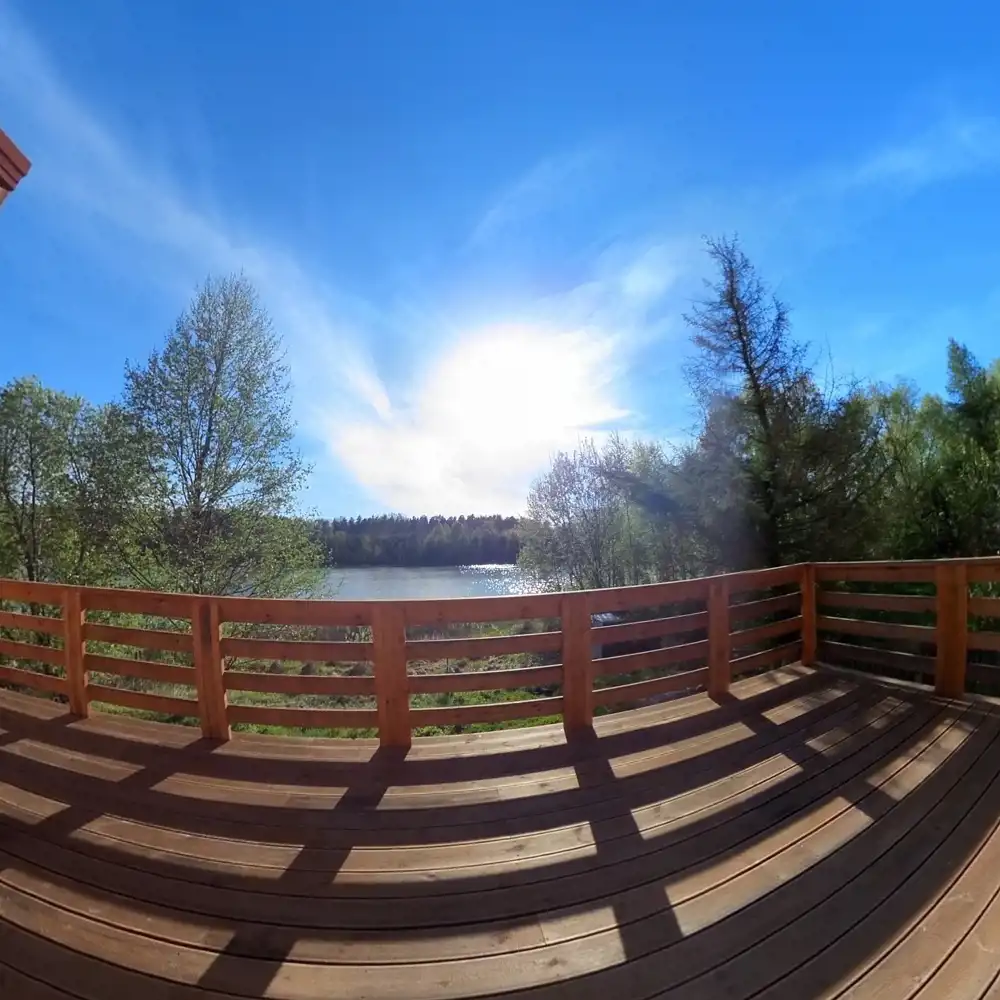 Wnętrze zmodernizowano, odnowiono i dobudowano przeszklony salon z tarasem z widokiem na taflę jeziora i las.