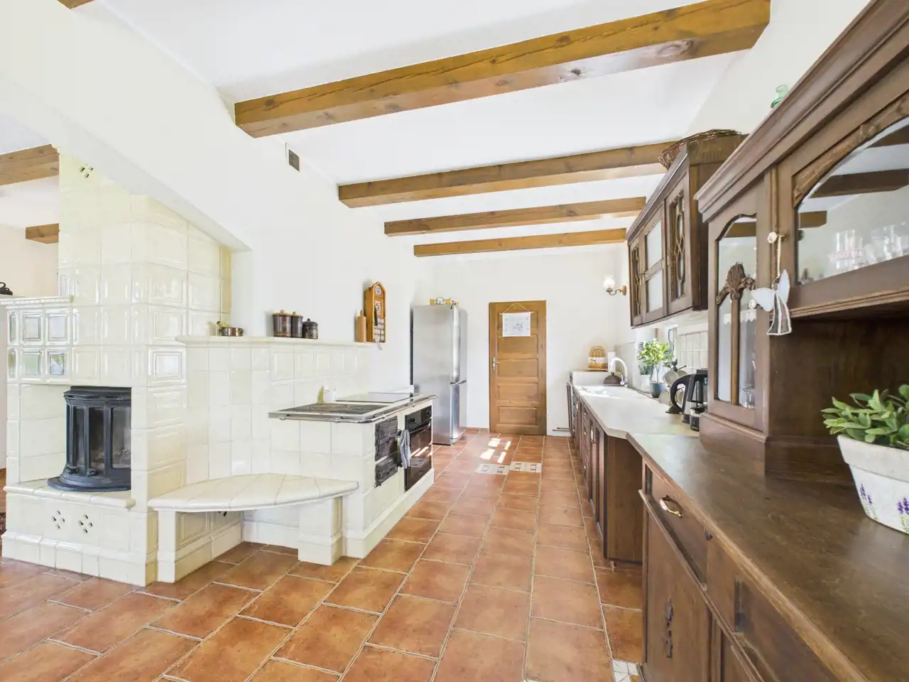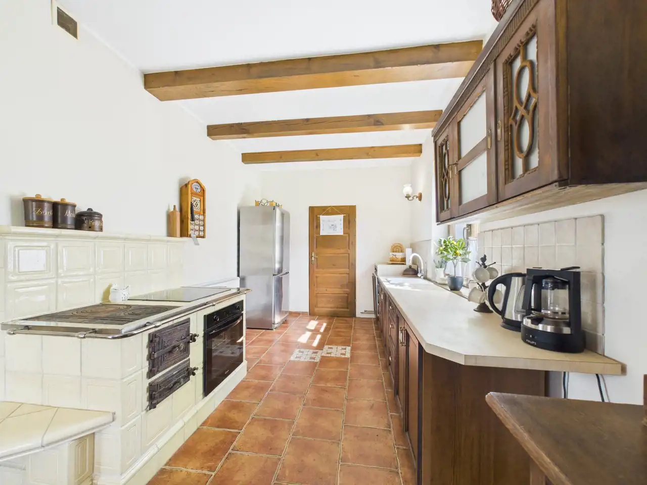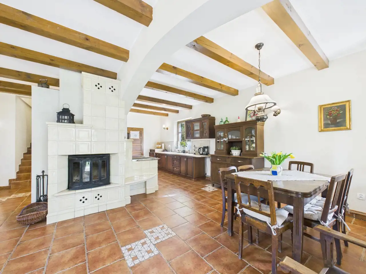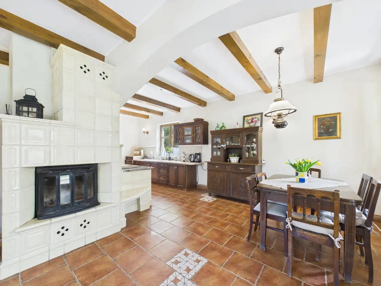 Ogrzewanie - pompa ciepła znajdująca się w pomieszczeniu gospodarczym przy kuchni, plus kominek.