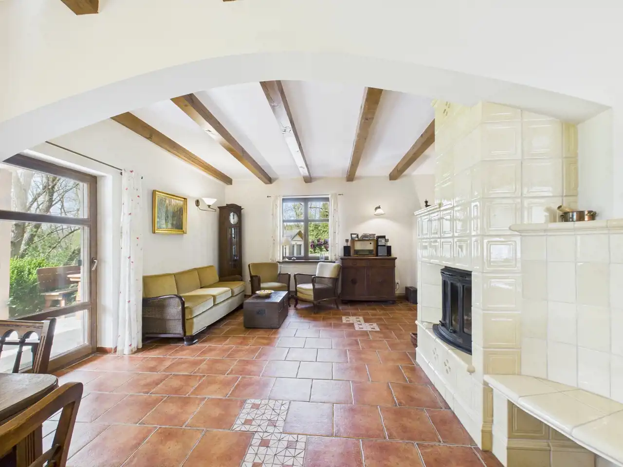 Z salonu wyjście na taras, z którego rozciąga się przepiękny widok na zieleń i rzekę.