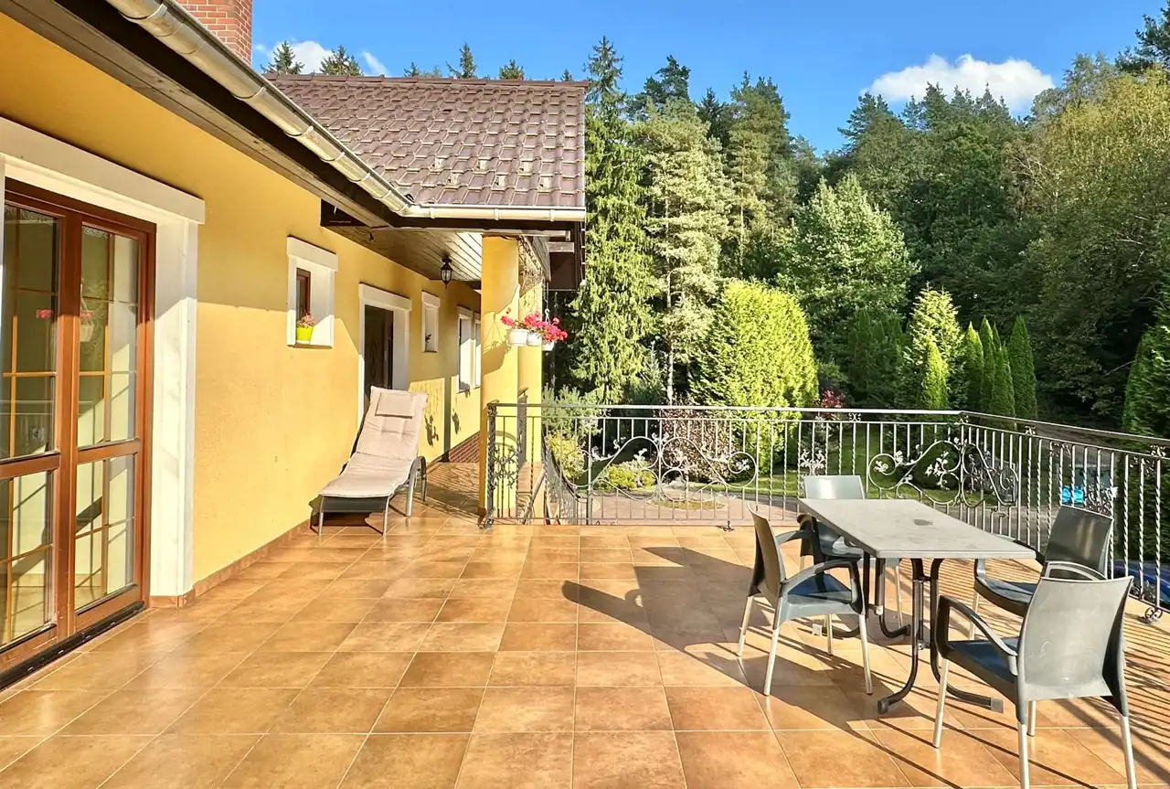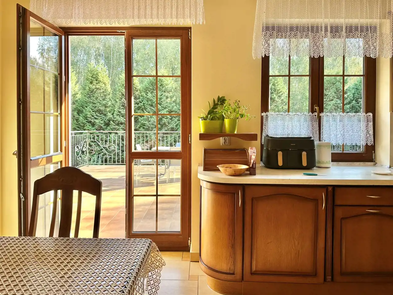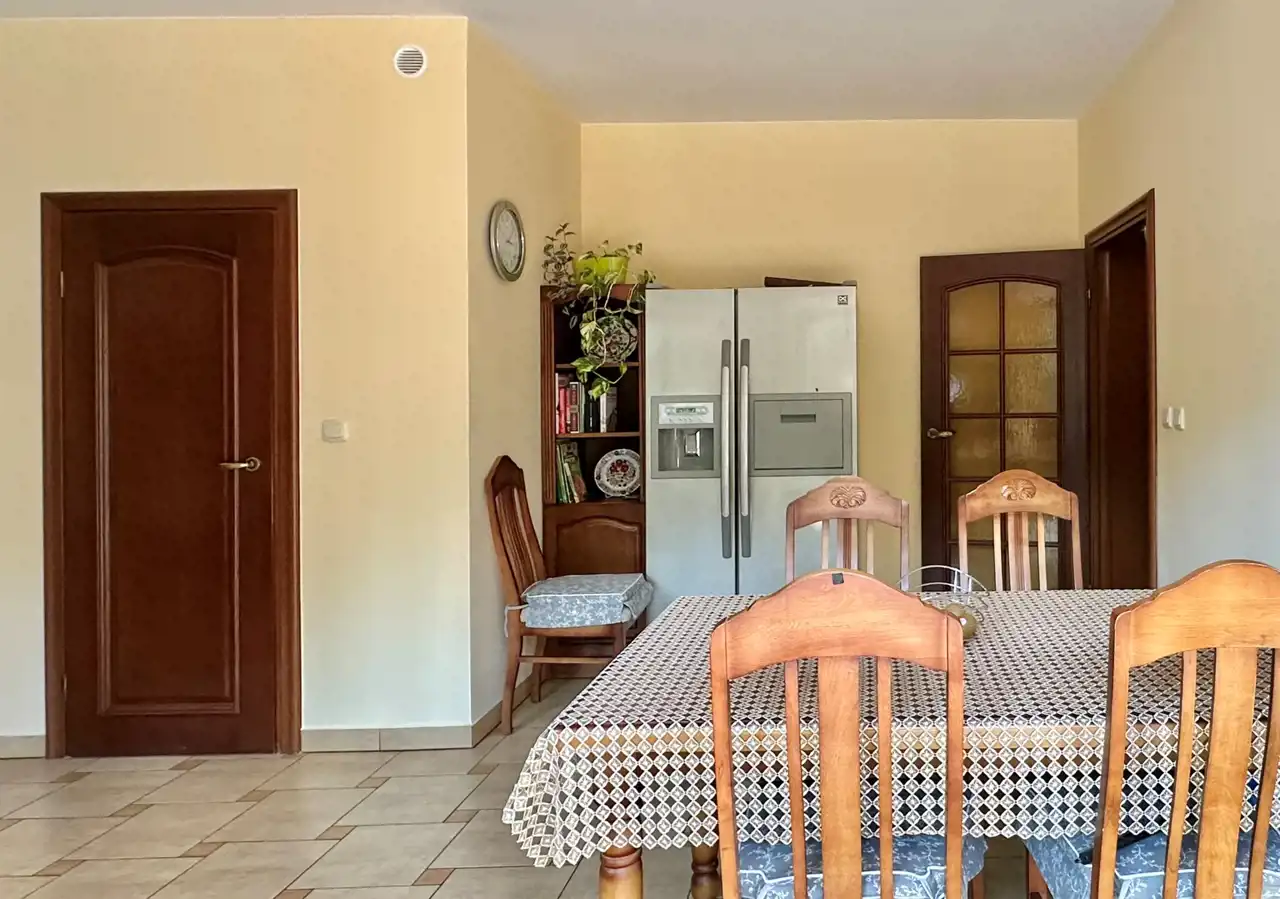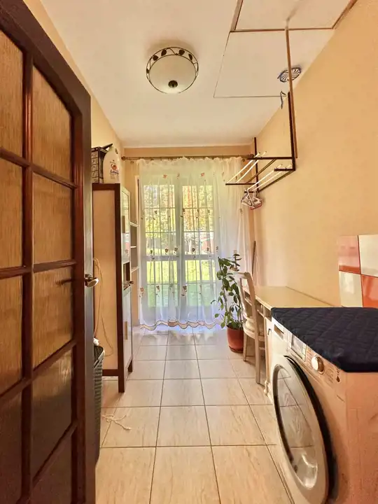 Stąd również wyjście na taras- co jest wygodne podczas organizowanych na obszernym tarasie (35m2) letnich spotkań towarzyskich. W tej części domu znajduje się także toaleta z natryskiem.