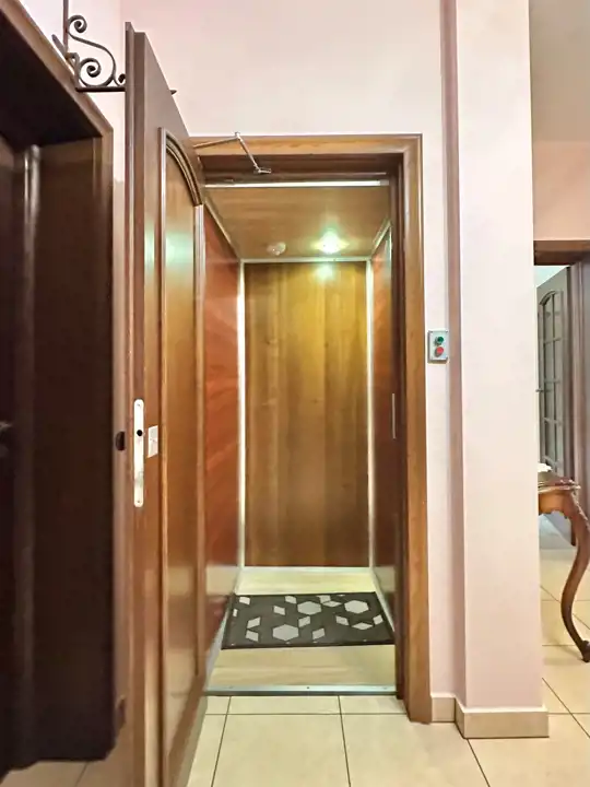 Do domu wchodzimy bądź po schodach, prowadzących przez taras do wnętrz, bądź korzystając z windy łączącej przyziemie z częścią mieszkalną.