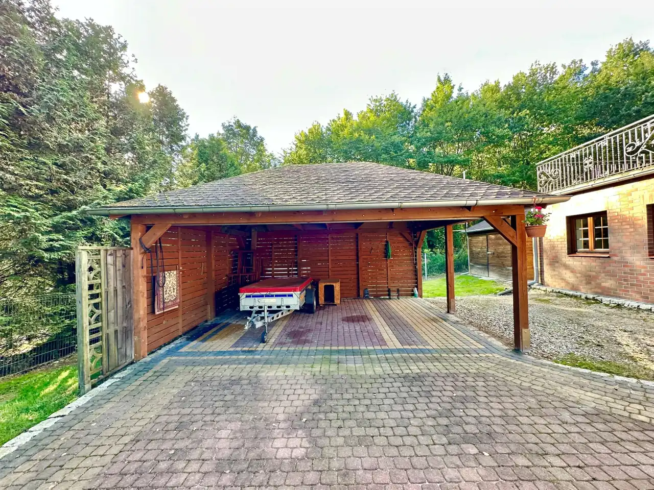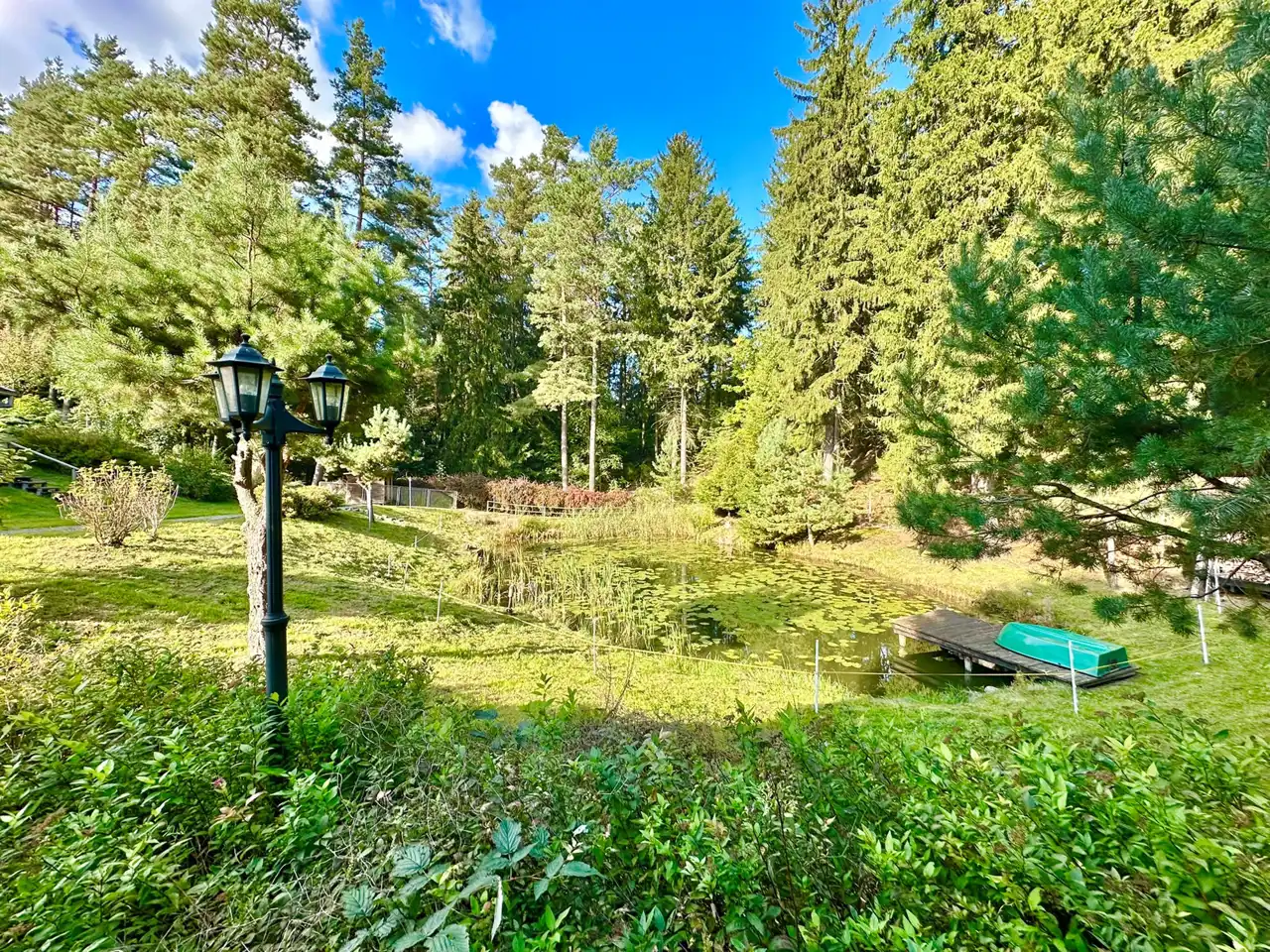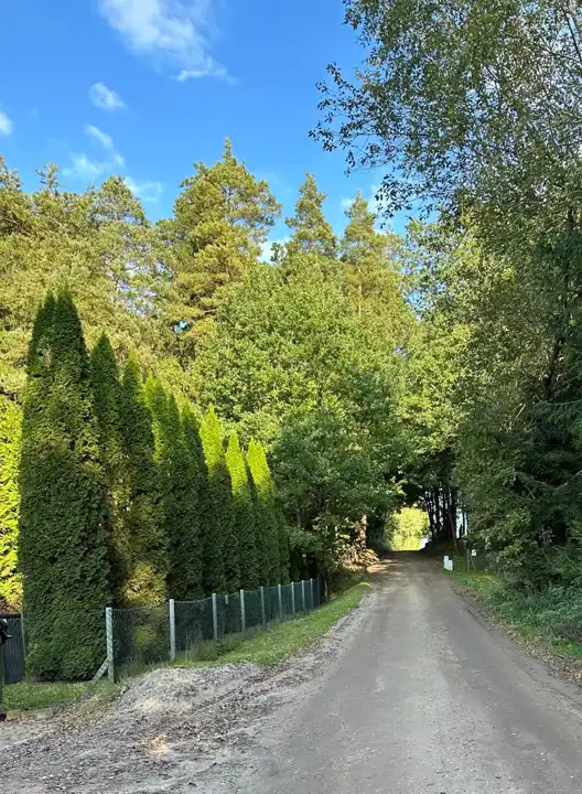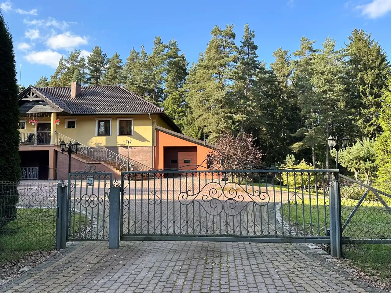 Działka na której znajduje się dom ma 3400 m2 i kształt zbliżony do prostokąta. Jest malownicza, falista, oddzielona szpalerami drzew od drogi a na pozostałych bokach przylega do ściany lasu otaczającego posiadłość. Partia działki od strony salonu to stosunkowo płaski trawnik. Tam też szereg drzew owocowych. Oświetlona jest stylowymi latarniami, przecięta brukowaną ścieżką. W najniższej części romantyczny zarybiony staw (ok 300m2) z pomostem i łódką. Tam też drewniana altana z murowanym grillem/wędzarnią, wiata na drewno kominkowe oraz wybieg dla psa z domkiem.