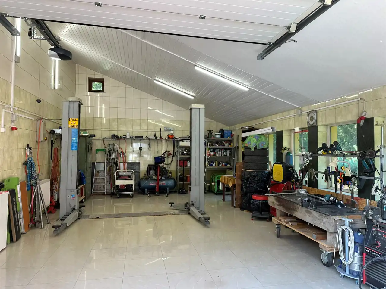 Poziom przyziemia (170 m2) zajmują dwa garaże (50 m2 i 35 m2) w tym jeden z elektrycznym podnośnikiem, pomieszczenie pełniące funkcję biura, pokój rekreacyjny (ew. recepcyjny), łazienka z prysznicem, kotłownia oraz pomieszczenia gospodarcze/magazynowe. Poziom wykończenia tej partii domu również w wysokim standardzie (glazura, terrakota itd.). Wysokość garaży z automatycznymi wrotami umożliwia garażowanie tam np. jachtu czy kampera.