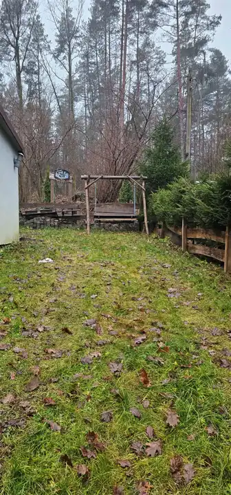 Na posesji znajduje się wydzielone miejsce rekreacyjne w którym posadowiona jest huśtawka oraz grill murowany. cała posesja jest ogrodzona drewnianym płotem.