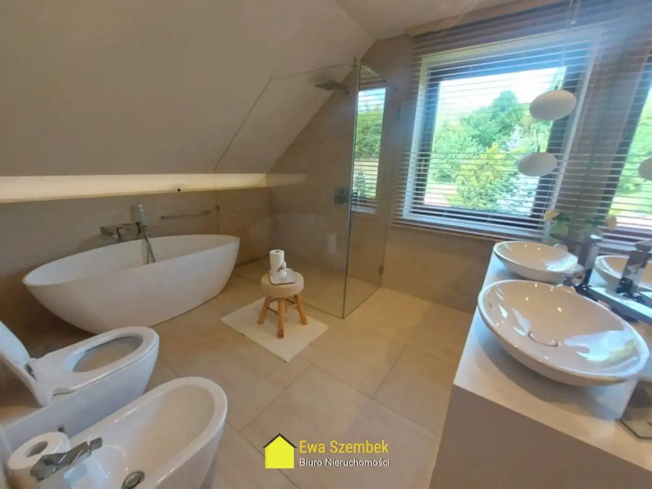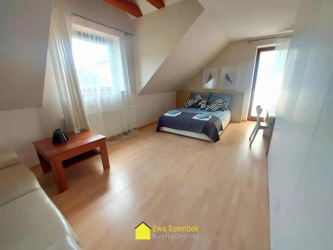 - Piętro: 3 sypialnie (w tym dwie z wyjściem na balkon), garderoba, łazienka.
