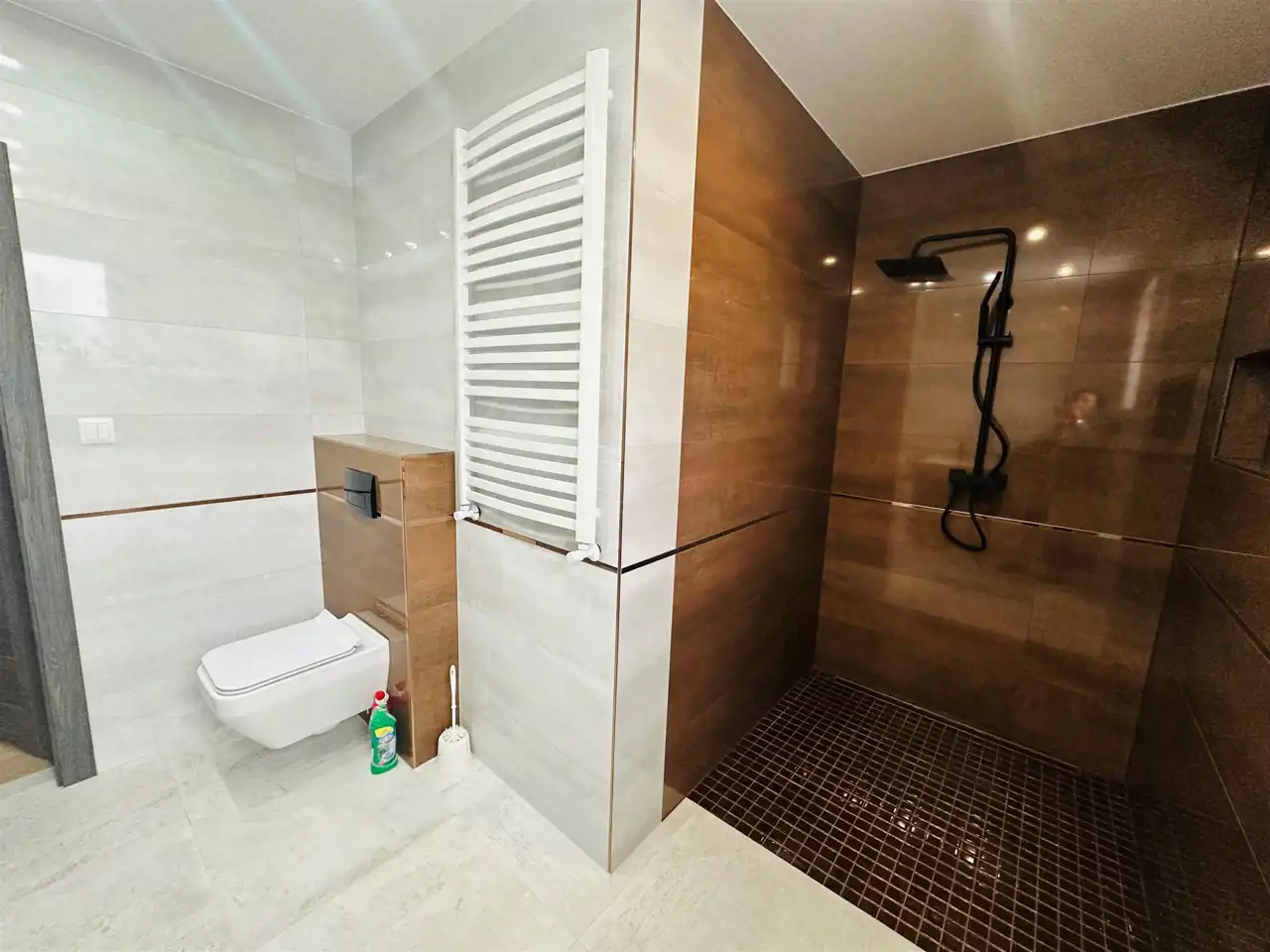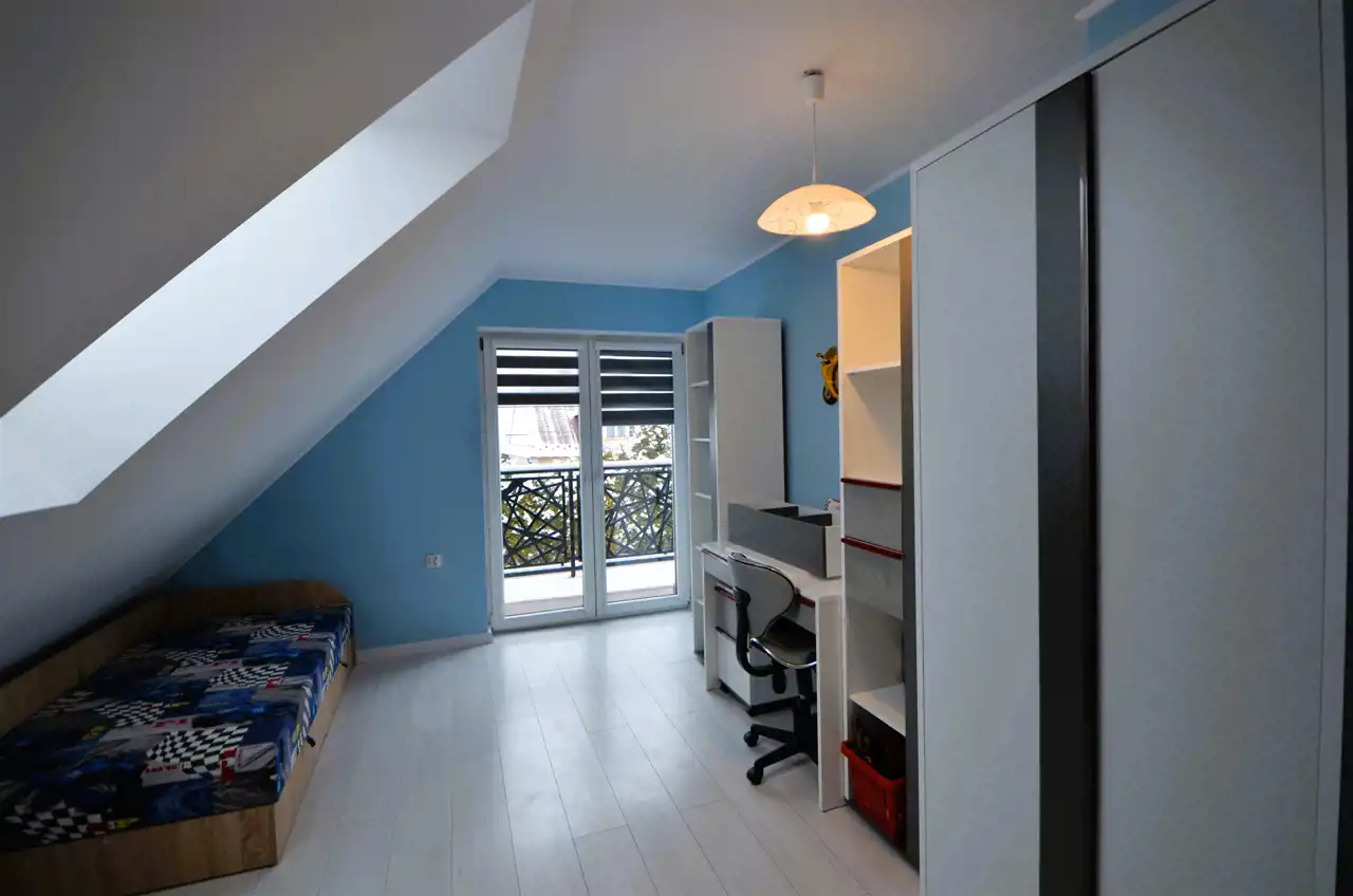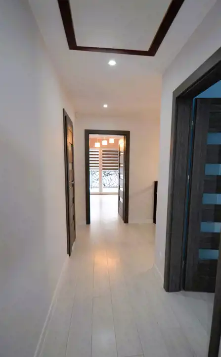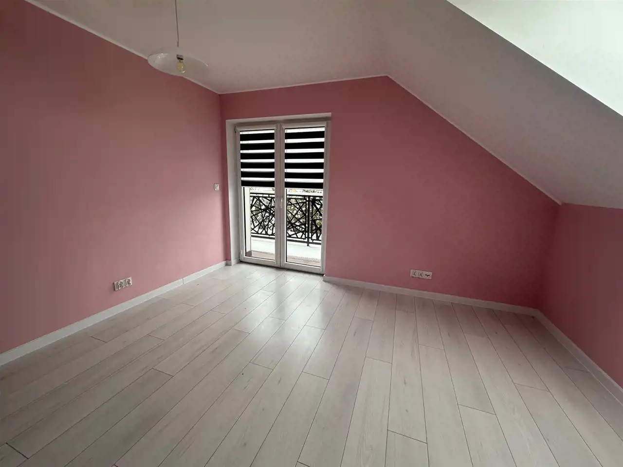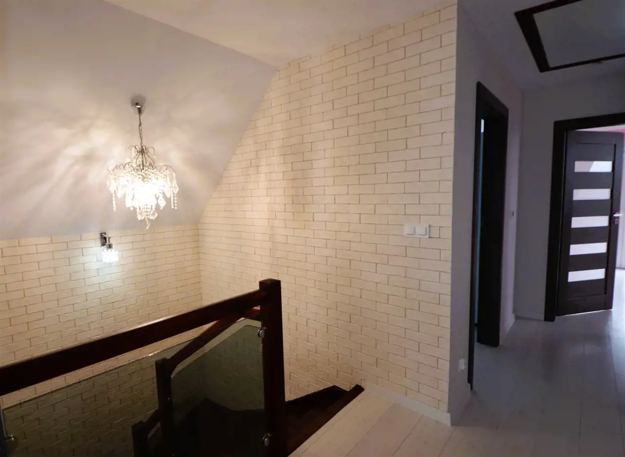 Na piętro prowadzą nowoczesne drewniane schody, gdzie mamy 3 sypialnie z balkonami i dużą łazienkę.