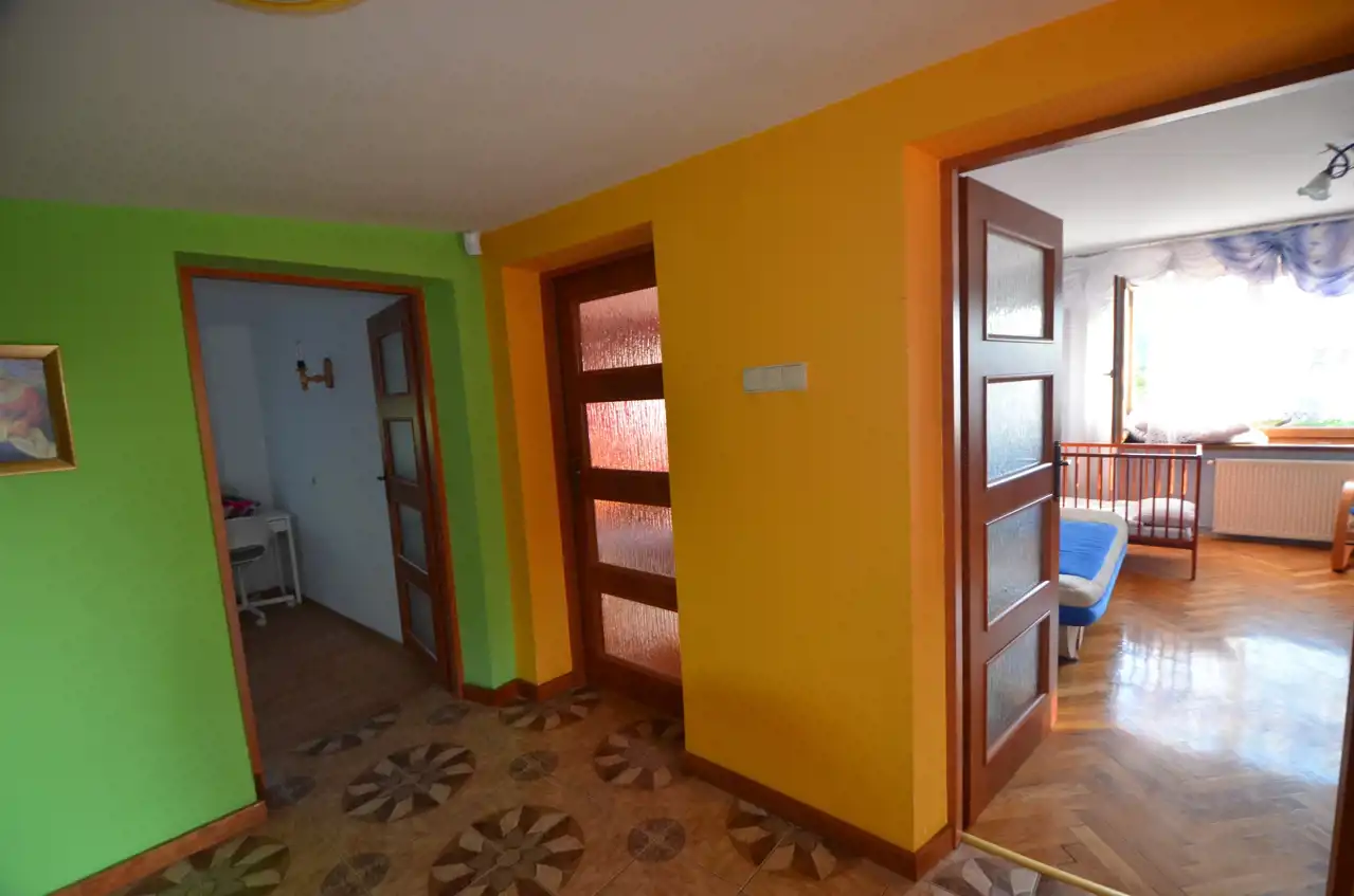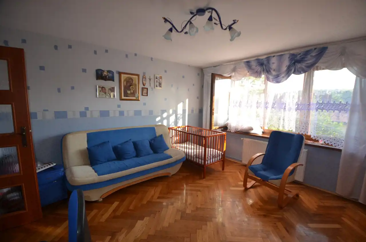 Na pietrze znajduje się salon z dużym tarasem, jasna oddzielna kuchnia, pokój, łazienka, przedpokój, główne wyjście na zewnątrz oraz klatka schodowa wykonana ze schodów dębowych prowadząca na kolejny poziom domu. Na piętrze znajdują się dwa pokoje z balkonem i jeden mniejszy pokój, który można zagospodarować na garderobę, łazienka, przedpokój z którego można również wyjść na niezależny balkon oraz na ostatni poziom domu który został do wykończenia. Super lokalizacja. W pobliżu sklepy i budynki użyteczności publicznej, szkoła, przedszkole, kościół, przystanek autobusowy.