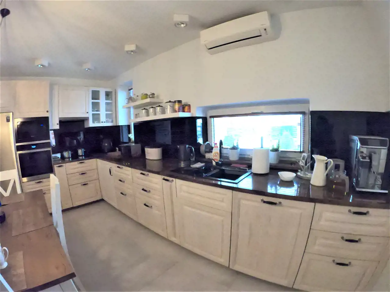 W kuchni klimatyzacja, meble na wymiar , fronty drewniane i blaty granitowe , na ścianie pomiędzy szafkami lakobel,