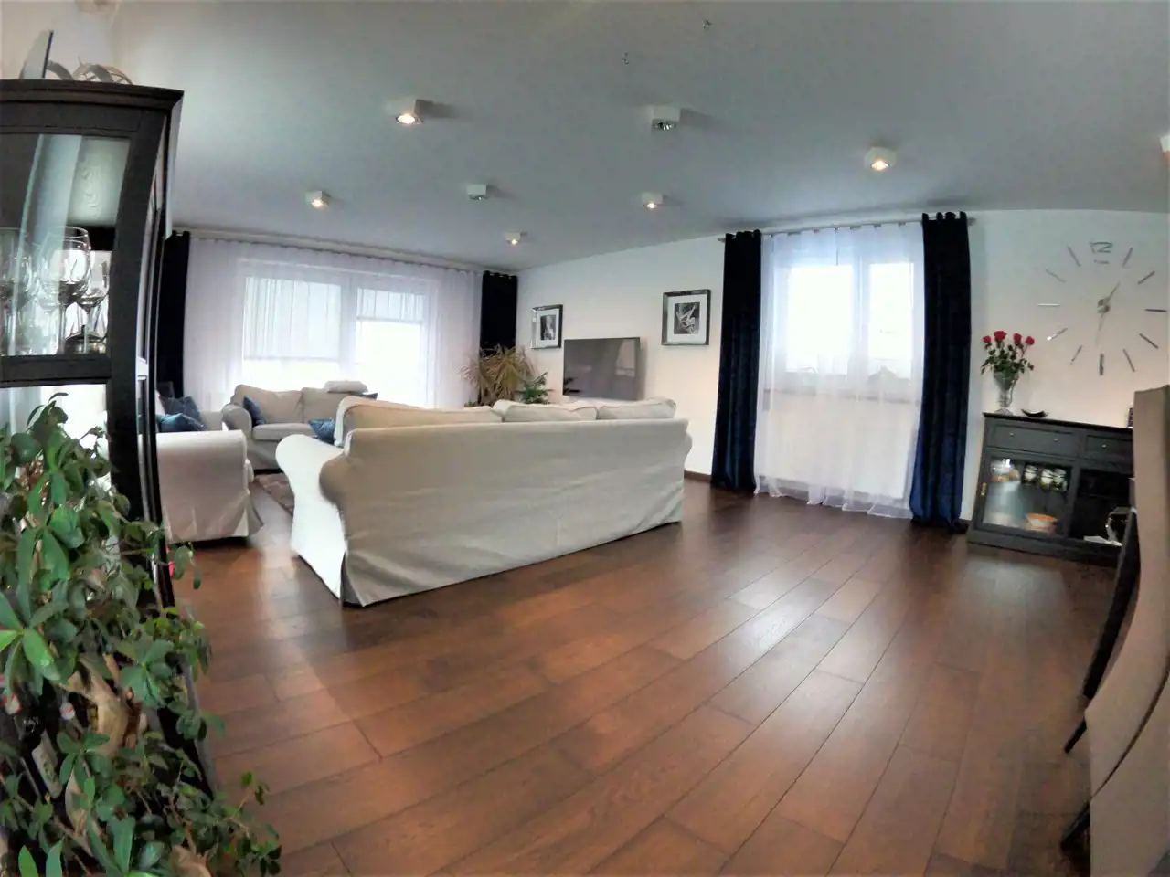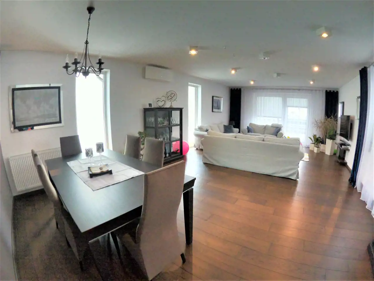 Duży i dobrze doświetlony salon, na podłogach deski dębowe, z tarasu wyjście na duży słoneczny taras z tarasolą