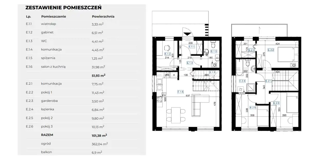 Mieszkania o powierzchni 60,27 m2 na parterze z przydomowym ogrodem, mieszkania o powierzchni 67,42 m2 na piętrze, z balkonem i poddaszem nieużytkowym oraz mieszkania dwupoziomowe o powierzchni 101 m2 z obszernym ogrodem oraz dodatkowym poddaszem nieużytkowym.