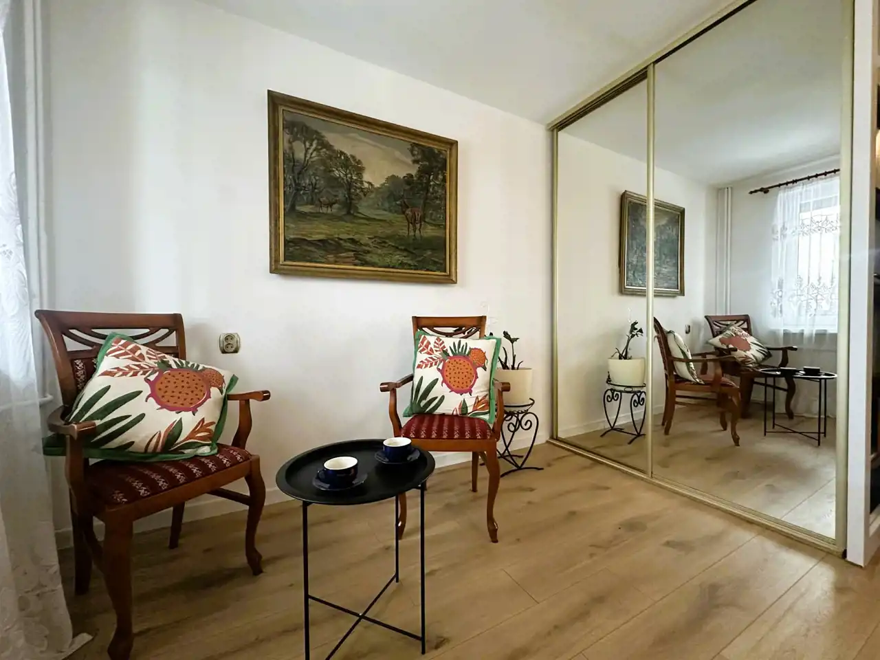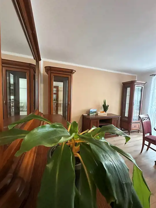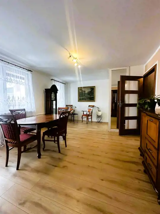 - Pokój dzienny: Przestronny i częściowo umeblowany, wyposażony w pojemną szafę w zabudowie. Z pokoju wychodzi się na zabudowany balkon, który zapewnia dodatkową przestrzeń i ciszę. Okno wychodzi na spokojny dziedziniec.