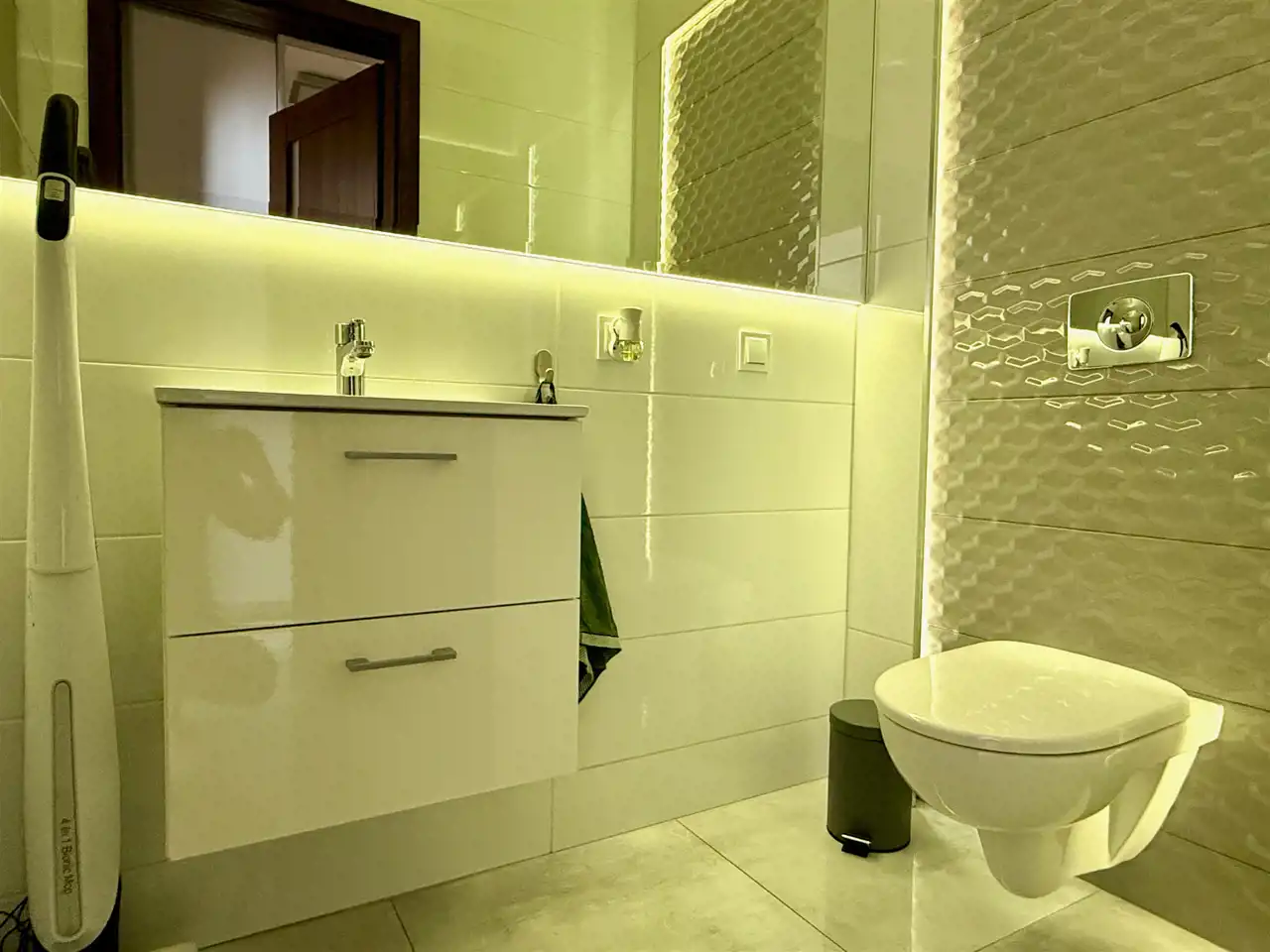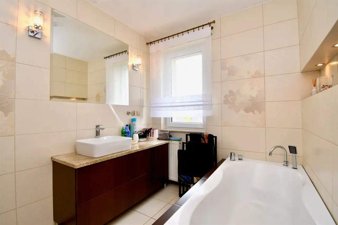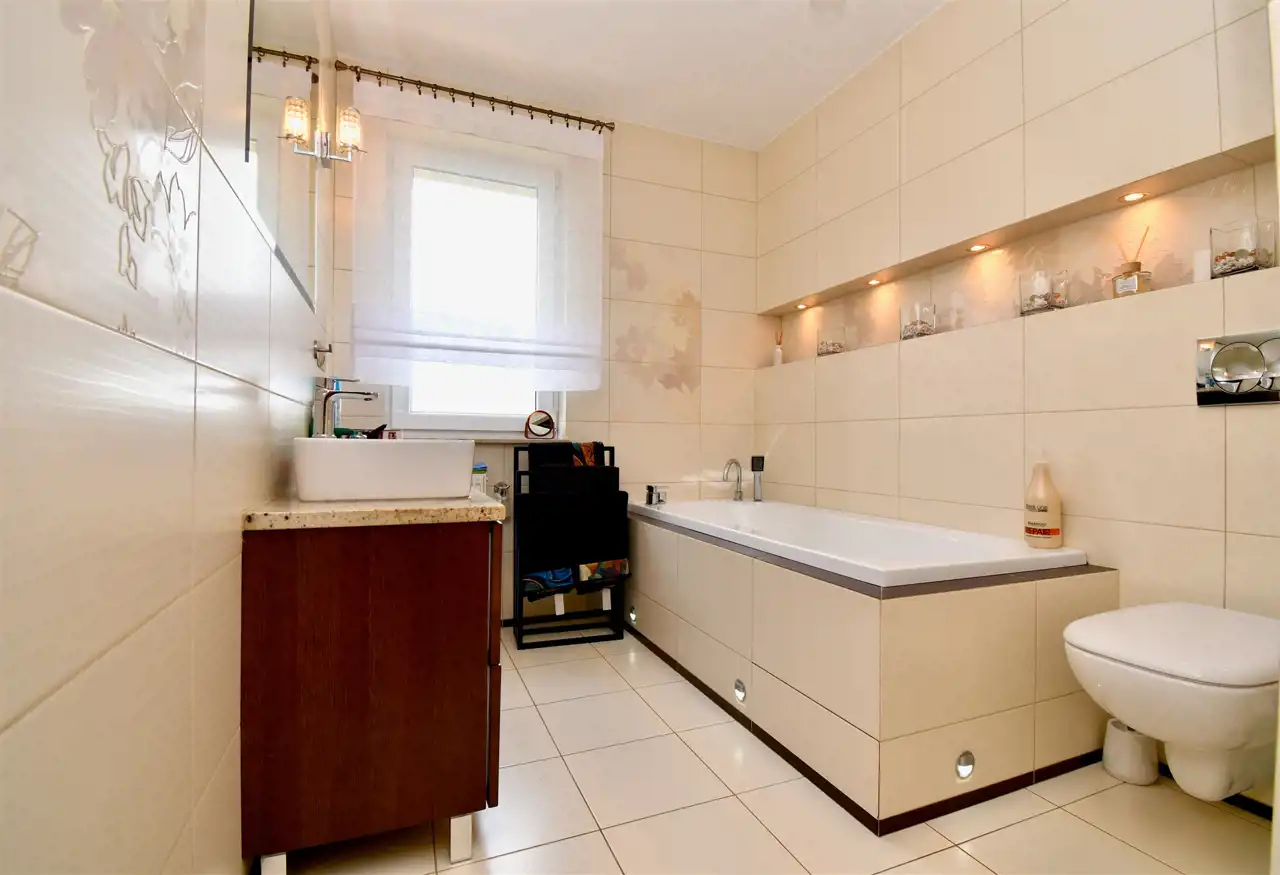 - Łazienki: 2 łazienki z WC w części głównej + osobne WC i łazienka w mieszkaniu