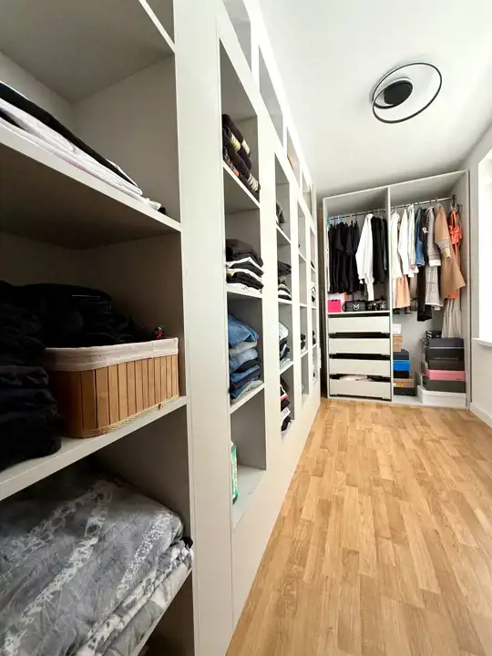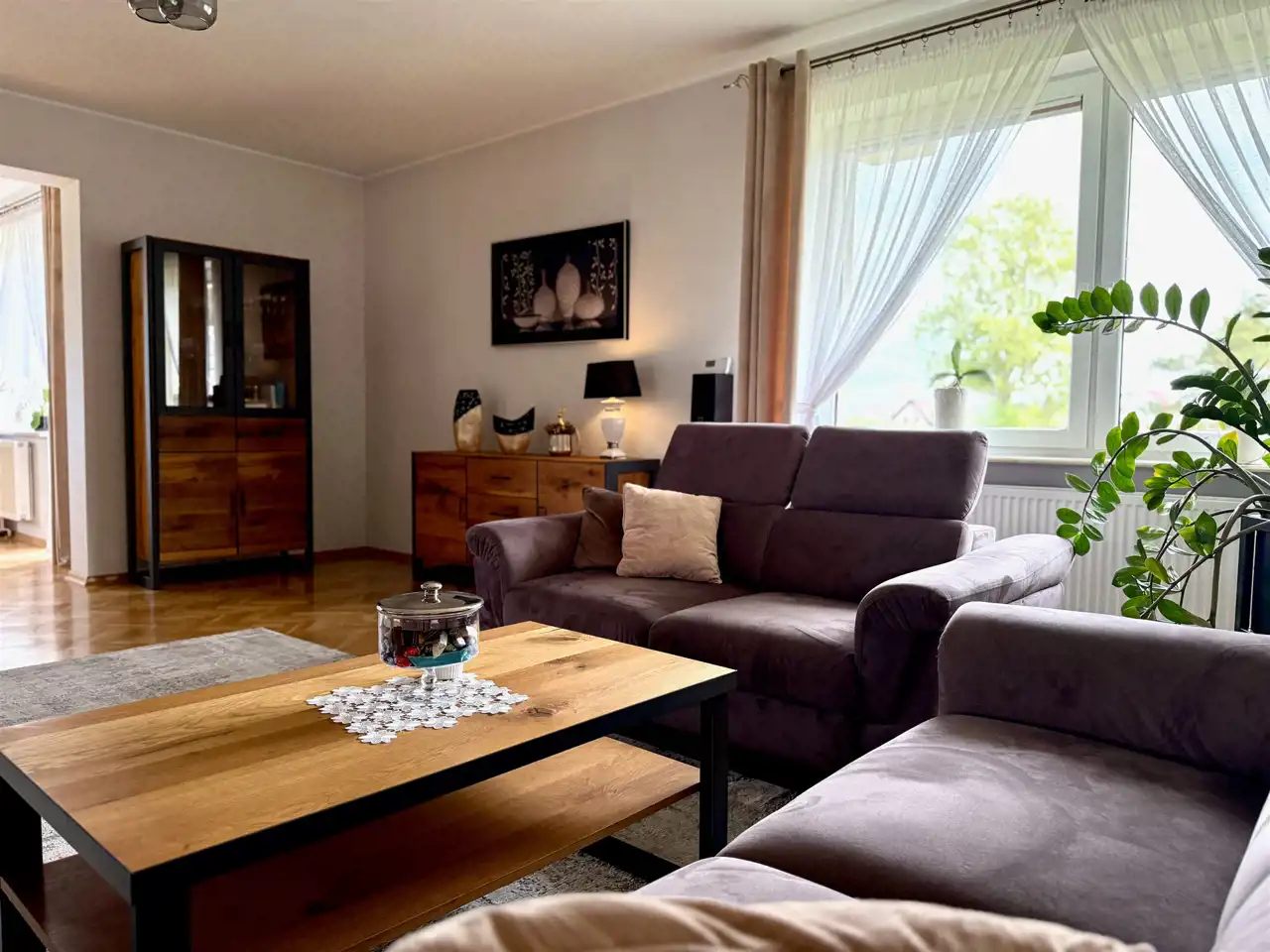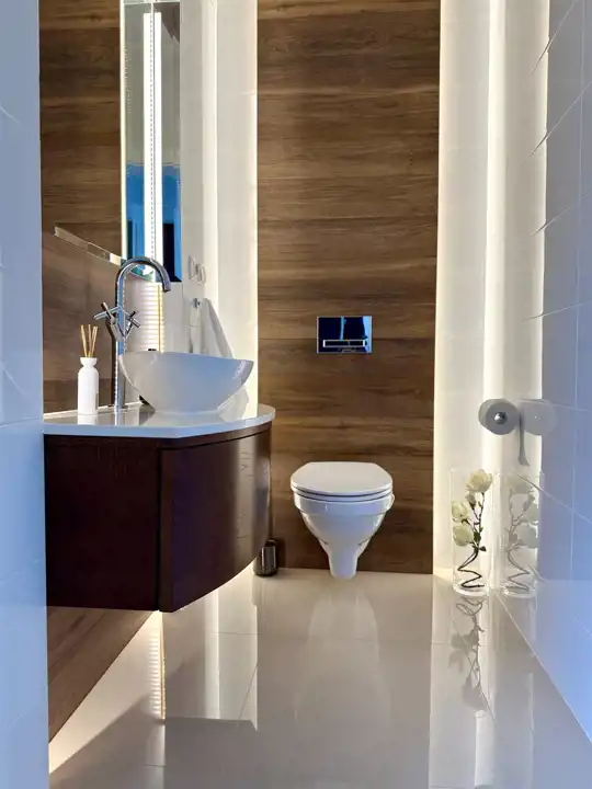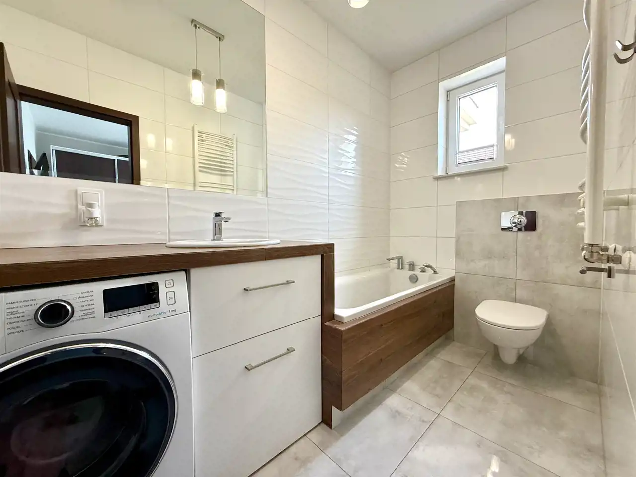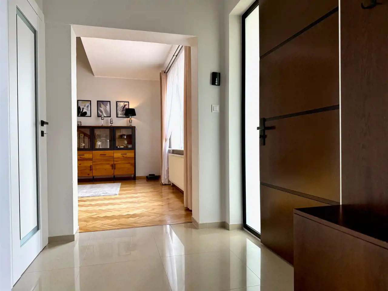 - Łazienki: 2 łazienki z WC w części głównej + osobne WC i łazienka w mieszkaniu