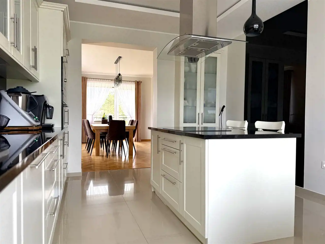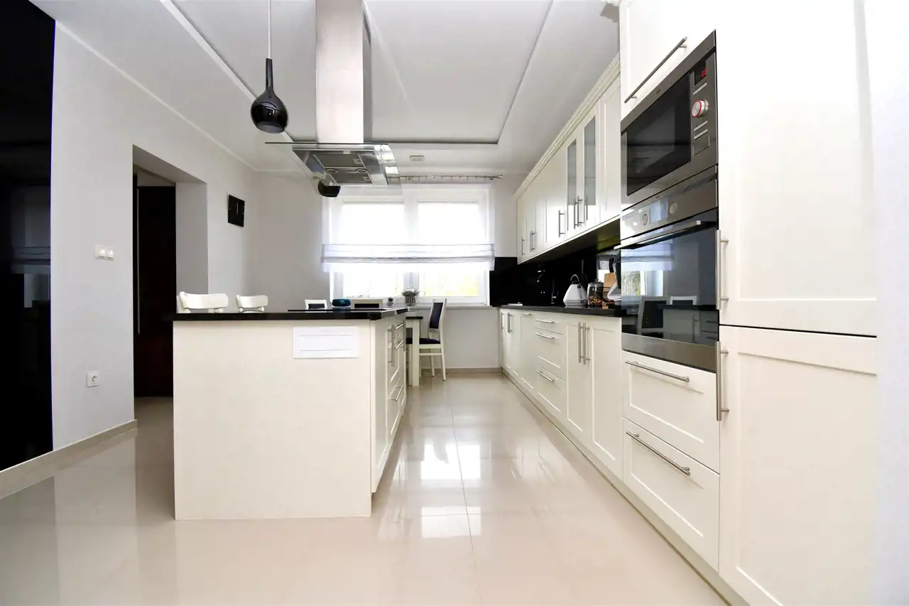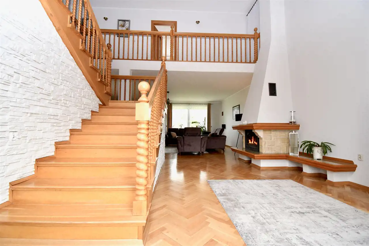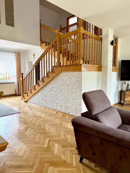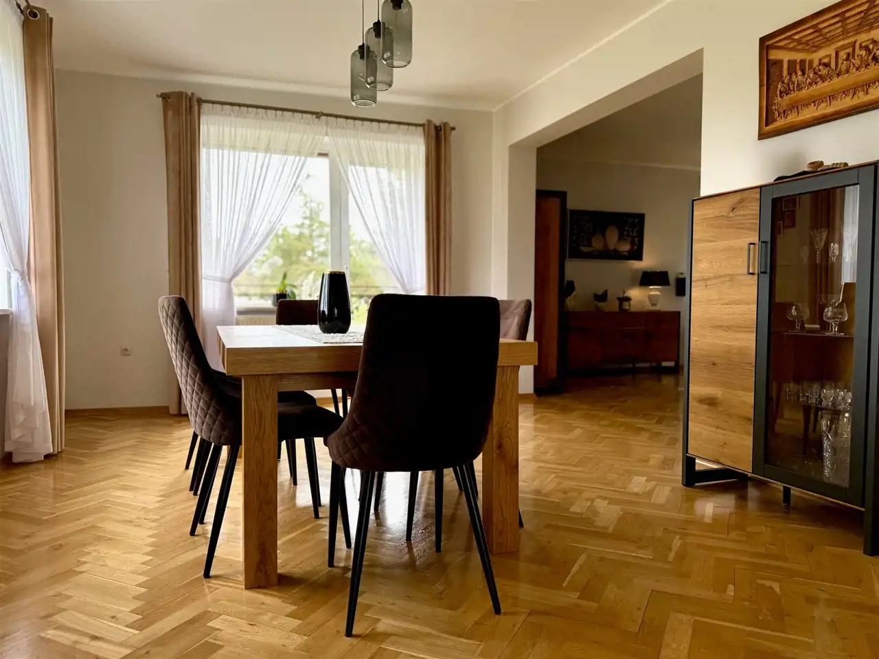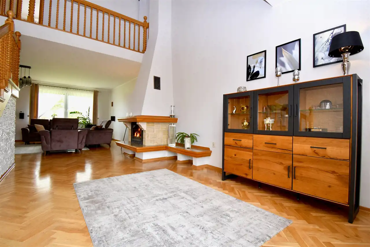 Wnętrze domu łączy klasyczny styl z nowoczesnymi rozwiązaniami. Podłogi w salonie i pokojach wykonano z naturalnego parkietu dębowego i bukowego, harmonizującego z dębowymi balustradami okazałych schodów. W holu, kuchni i jadalni zastosowano terakotę, a w łazienkach i WC – wysokiej jakości glazurę. Ściany zdobią gładzie gipsowe, tynki ozdobne, cegła oraz szkło w zabudowie kuchennej. Instalacje elektryczne i hydrauliczne wykonano z miedzi, zapewniając trwałość i niezawodność. W cenie pozostają szafy garderobiane, zabudowy kuchenne oraz sprzęt AGD.