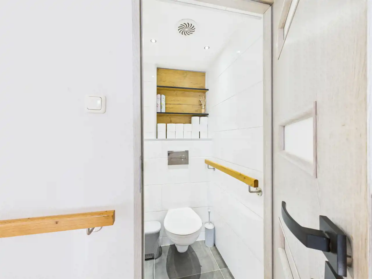 Parter: salon z częścią wypoczynkową i jadalnianą (29m2), oddzielna kuchnia (13,3m2), toaleta, łazienka (6,9m2), hol / komunikacja (4,3m2), wiatrołap (9,4m2)
