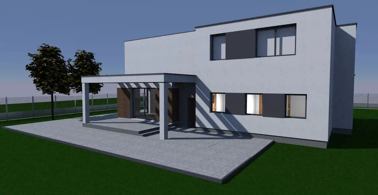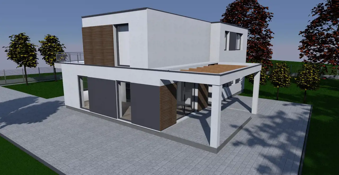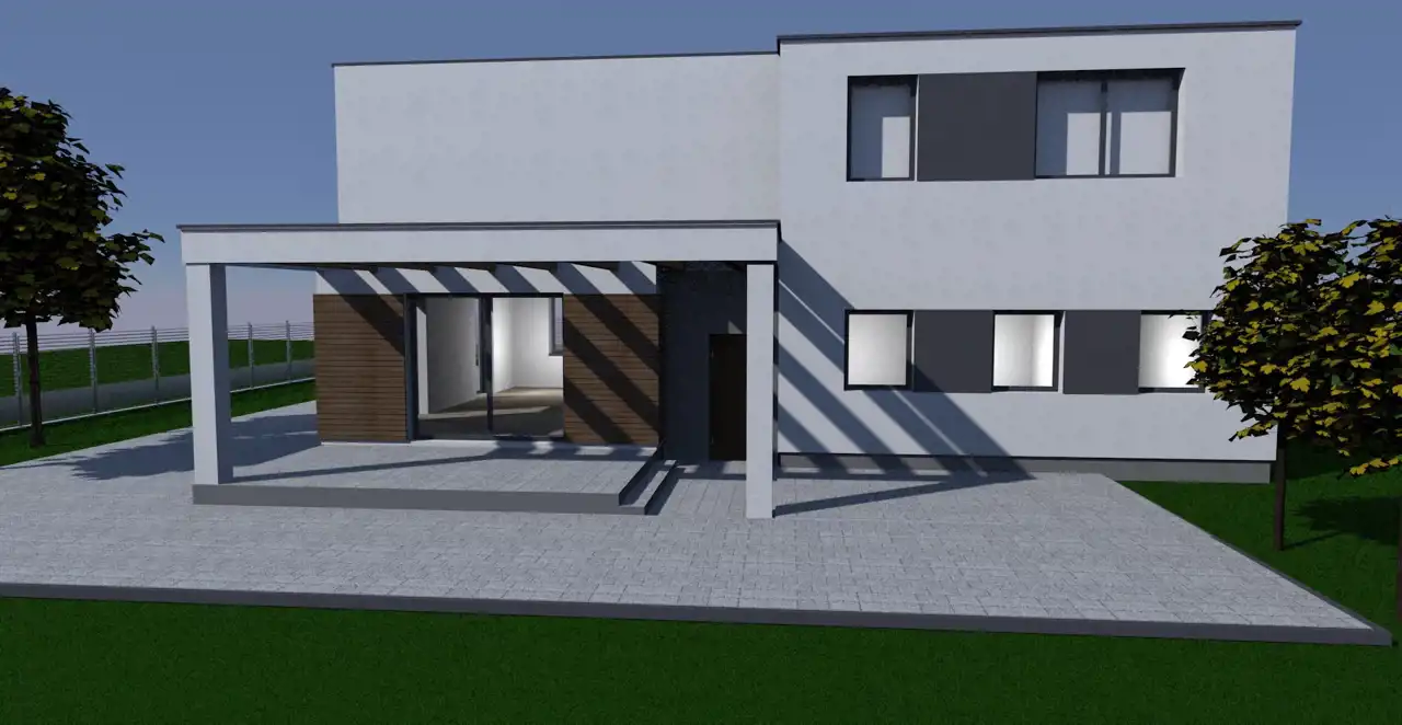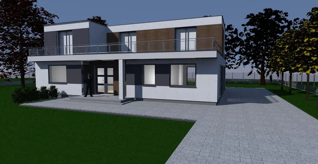 Media: woda w działce, prąd, gaz i światłowód w drodze, warunki zabudowy budynkiem mieszkalnym oraz gospodarczym. Na załączonych zdjęciach wizualizacje projektu domu.