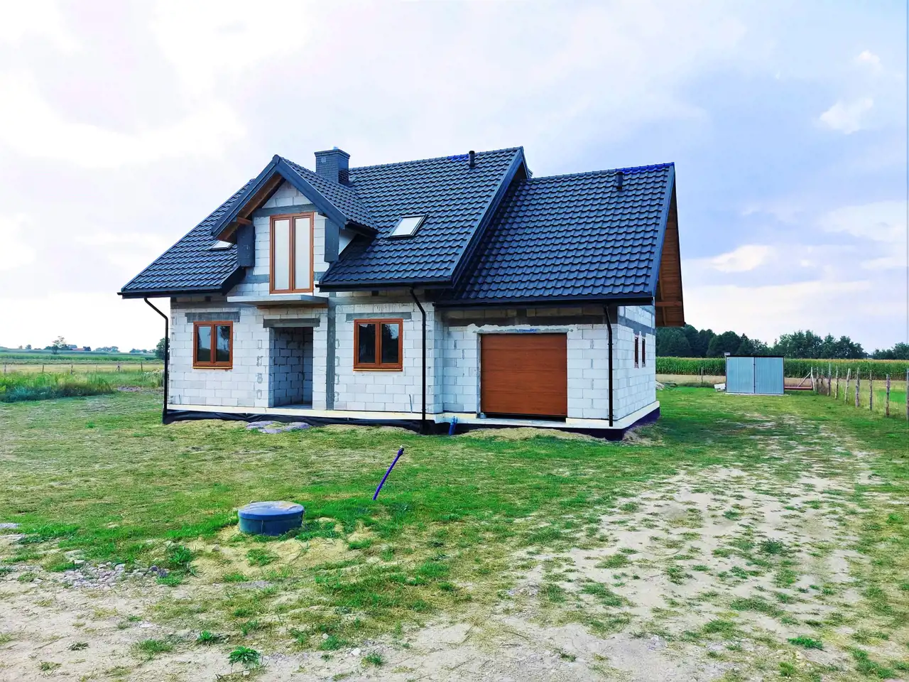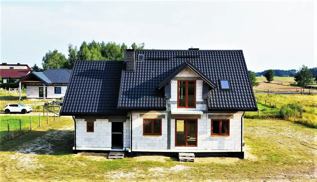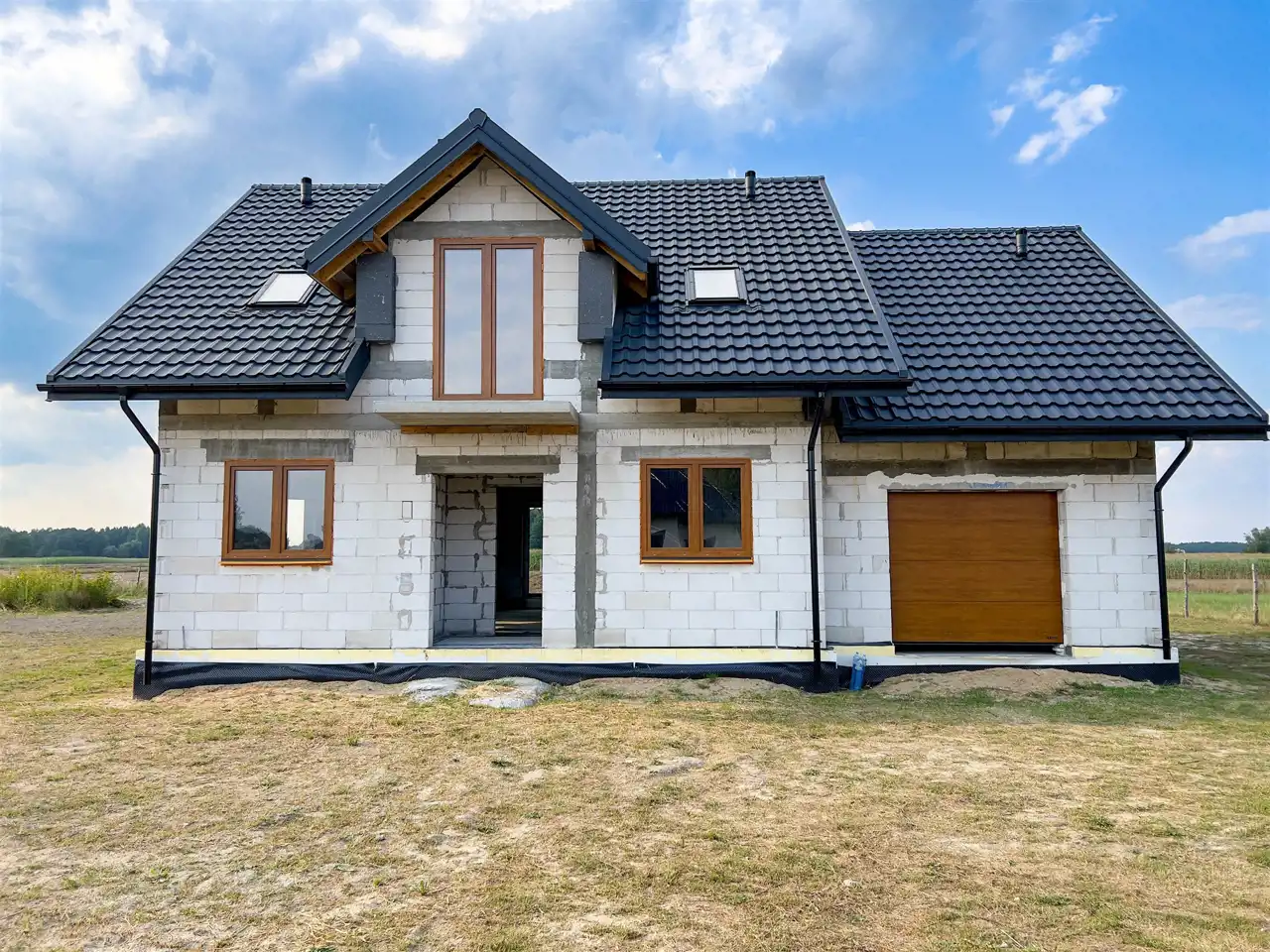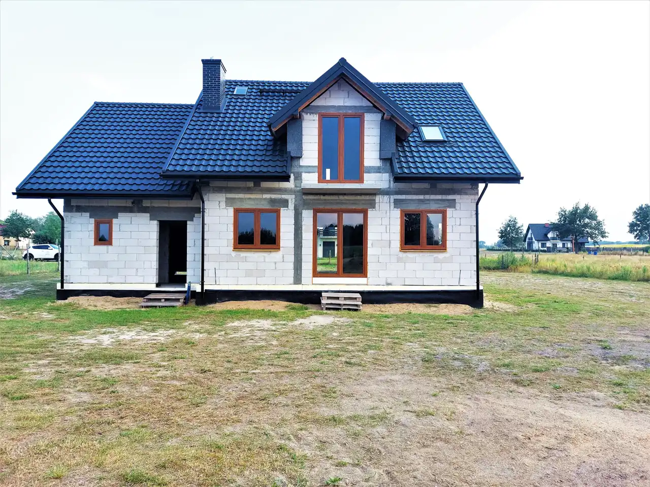 Dom z użytkowym poddaszem. Nieruchomość wybudowana w technologii tradycyjnej, murowanej z dachem dwuspadowym wyłożonym blachodachówką w kolorze czarny mat. Stolarka okienna w kolorze brązowym. Ściany zewnętrzne oraz wewnętrzne murowane z bloczków silikonowych (24 cm klasy 15Mps), ze stropem gęstożebrowym typu Teriva grubości 24 cm oraz stropem żelbetowym monomitycznym grubości 24 i 16 cm w rejonie kominów i schodów. Budynek pokryty dachem dwuspadowym o kącie pochylenia 40 °. Dach budynku spoczywa na zwieńczonej wieńcem i usztywnionej trzpieniami żelbetowymi ściance kolanowej. Konstrukcja więźby – drewniana. Posadowienie budynku bezpośrednie na ławach i stopach fundamentowych.