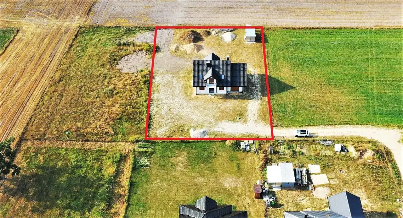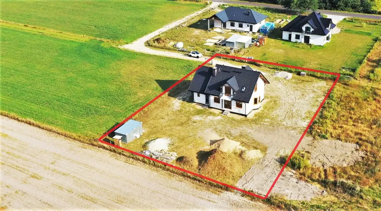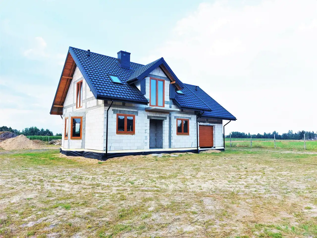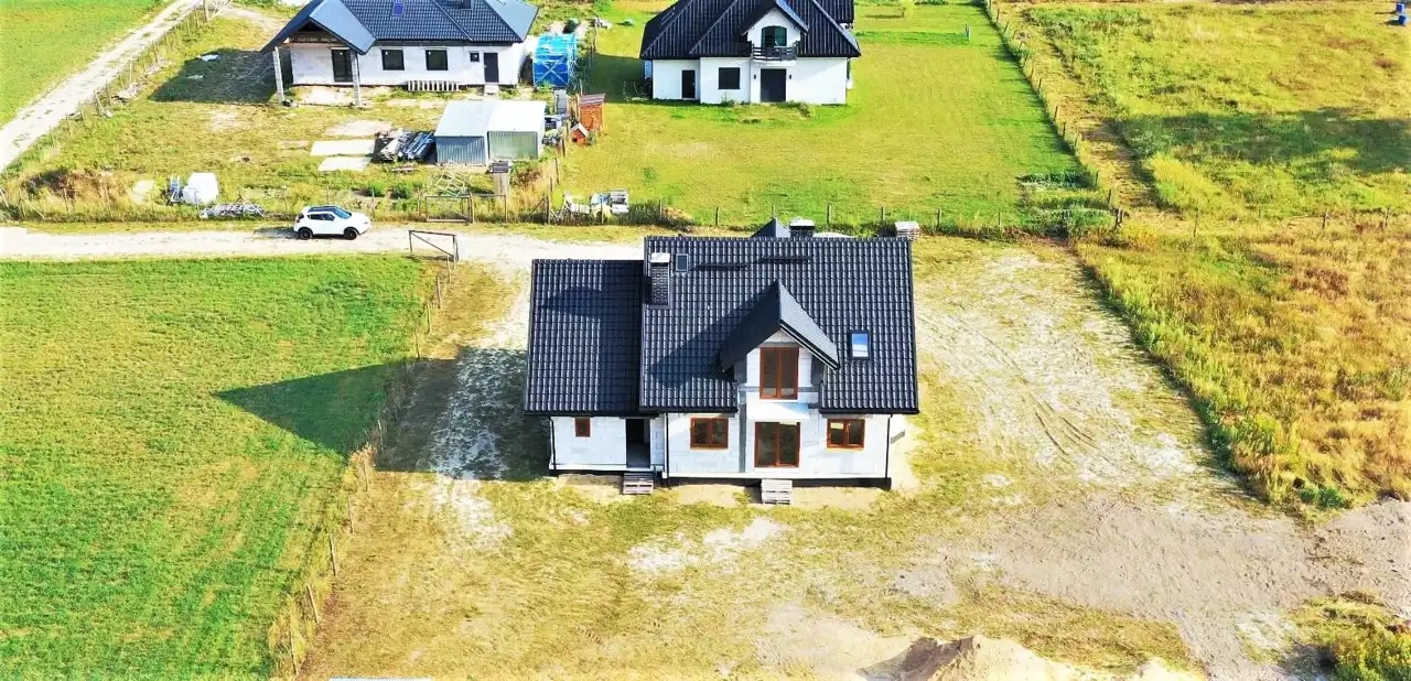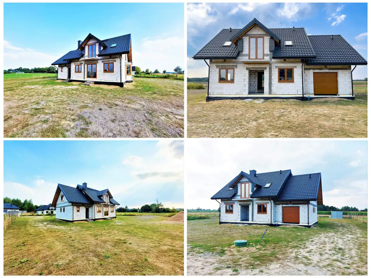 Dom z użytkowym poddaszem. Nieruchomość wybudowana w technologii tradycyjnej, murowanej z dachem dwuspadowym wyłożonym blachodachówką w kolorze czarny mat. Stolarka okienna w kolorze brązowym. Ściany zewnętrzne oraz wewnętrzne murowane z bloczków silikonowych (24 cm klasy 15Mps), ze stropem gęstożebrowym typu Teriva grubości 24 cm oraz stropem żelbetowym monomitycznym grubości 24 i 16 cm w rejonie kominów i schodów. Budynek pokryty dachem dwuspadowym o kącie pochylenia 40 °. Dach budynku spoczywa na zwieńczonej wieńcem i usztywnionej trzpieniami żelbetowymi ściance kolanowej. Konstrukcja więźby – drewniana. Posadowienie budynku bezpośrednie na ławach i stopach fundamentowych.