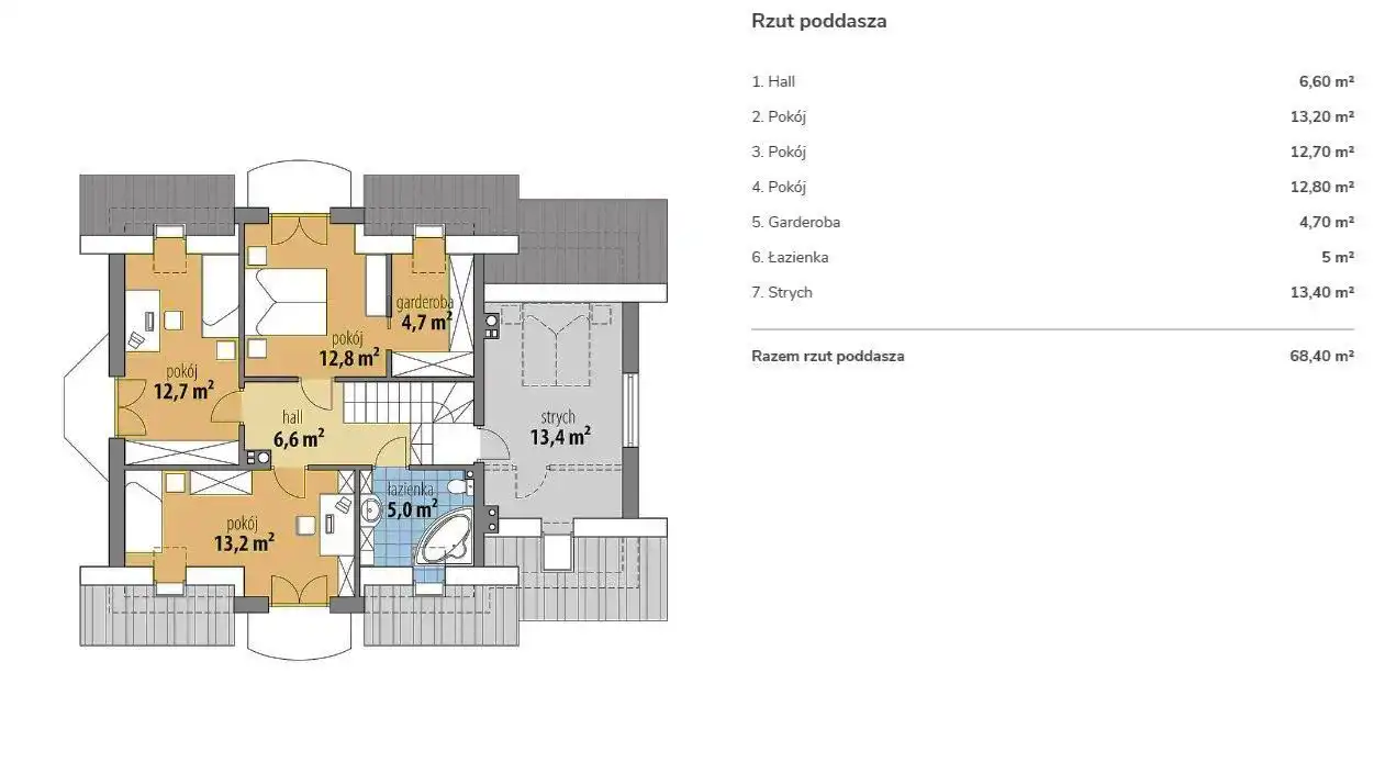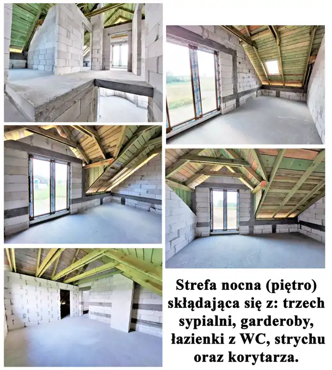strefę nocną (piętro): trzy sypialnie, garderobę, łazienkę z WC, strych oraz korytarz.